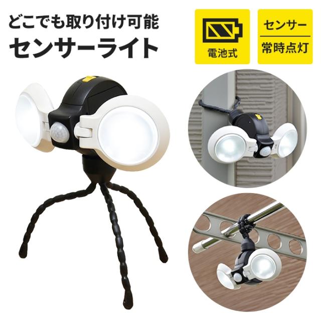 センサーライト ダブル 電池式 乾電池 LED ライト 0.75W 2灯 IP43 防雨 マグネット付き 自由に曲がる三脚