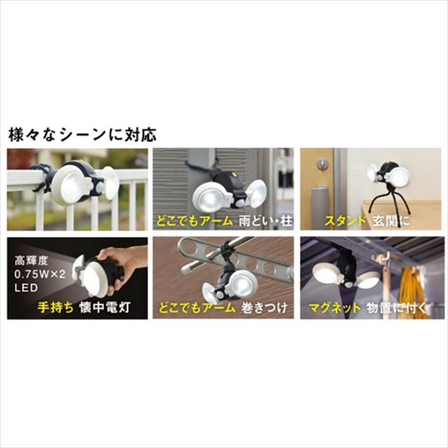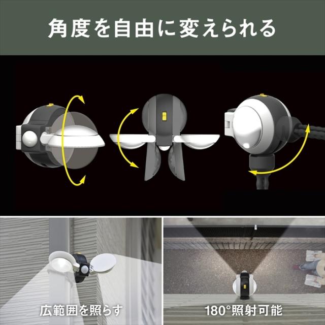 | フリーアームでこれまでにない自由な配光。 どこでもセンサーライトダブルです。 ライトの方向自由自在。 防雨タイプ。 近づくとパッと点灯。 センサーで自動消灯。 どこでもアームで雨どい・柱に、スタンドで玄関に、手持ちで懐中電灯に。 照明・防犯・節電など、様々なシーンに対応します。 マグネット(付属)で物置にも設置いただけます。 脱着式三脚付き。 |