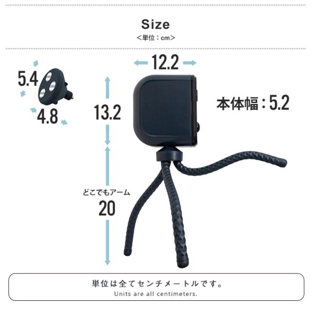 | [本体]幅5.2×奥行12.2×高さ13.2cm [どこでもアーム]20cm [マグネットベース]幅5.4×奥行5.4×高さ4.8cm |