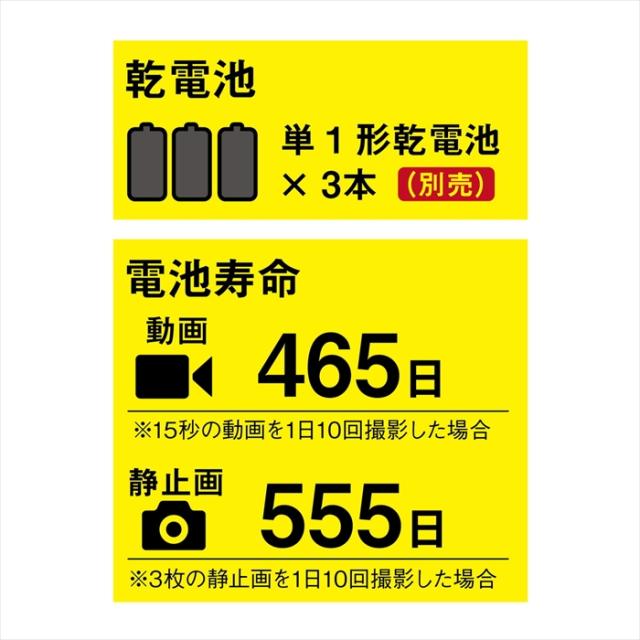 | ・ 電池:単1形アルカリ乾電池3本(別売り) ・ 電池寿命:〈動画モード〉465日/15.5か月(15秒の動画を1日10回撮影した場合) 〈静止画モード〉555日/18.5か月(3枚の静止画を1日10回撮影した場合) ・ モード切り替え:動画モード/OFF/静止画モード ・ 有効画素数:92万画素 HD(1280×720) ・ カメラ撮影範囲:水平90°/垂直50°(昼夜関係なくセンサーが反応すると撮影開始) ・ ファイル形式:〈動画〉AVI(音声なし)/〈静止画〉JPG ・ 撮影時間:〈動画〉1ファイルあたり15秒~(撮影時間が60秒を超えると次のファイルを作成) ・ 撮影枚数:〈静止画〉3枚連写(センサーが反応し続けた場合5秒おきに撮影) ・ 録画媒体:8~128GBまでのマイクロSDHCまたはSDXCカード(別売り) ・ 電球:赤外線LED×6(周囲が暗いときのみ点灯) ・ 探知方式:焦電形赤外線センサー ・ 探知範囲:最大100°最遠5m(取り付け高さ1.5m時) |
