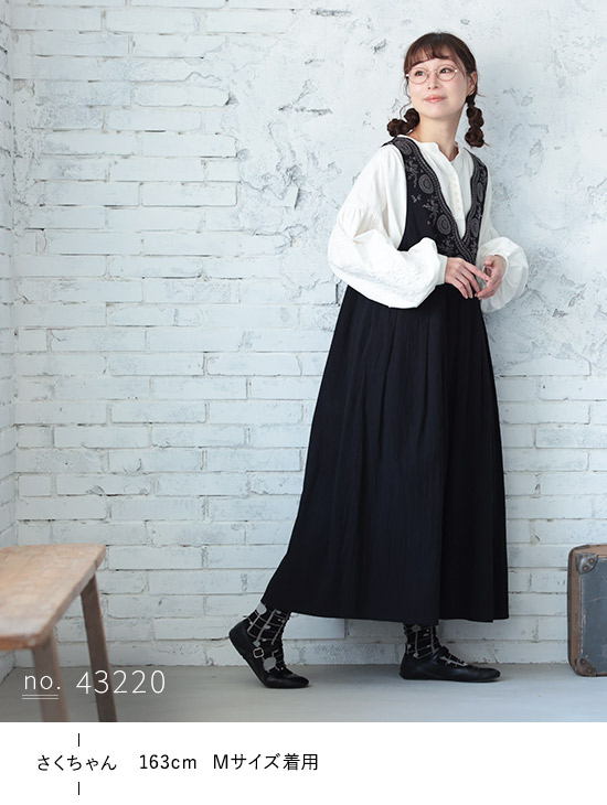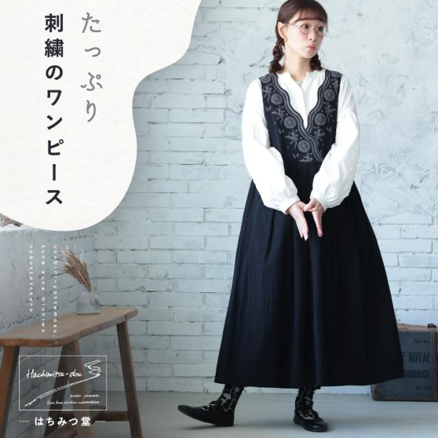 はちみつ堂 たっぷり刺繍のワンピース レディース ジャンパースカート ジャンスカ ノースリーブ Vネック フレア Aライン 麻混