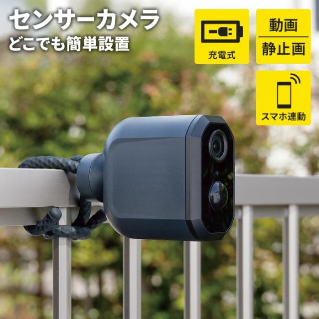 | スマホ連動センサーカメラ。 充電式で配線不要、自由に曲がるアームでどこでも取付け。 録画・記録。 人が近づくとセンサー感知でカメラが作動し自動撮影します。 スマートフォンに通知が届き、離れた場所でもお手元のスマートフォンで映像確認ができます。 いつでもリアルタイムでカメラ映像を見ることができ、静止画や動画をスマートフォンに保存することができます。 防犯対策、害獣確認、ペットやお子様の見守りカメラとして暮らしの安全・安心をサポートします。 防雨タイプで屋外でも設置可能です。 ※カメラはWiFi接続が必要です。 ※センサー探知時の自動映像記録はマイクロSDカード(別売)が必要です。 繰り返し使える便利な充電式で煩わしい配線や電池交換は不要です。 どこでもアームであらゆる場所に巻き付けて取付けでき、アームを外せば強力マグネットで金属面に設置できます。 夜間は自動で赤外線撮影をおこないますので周囲が暗い環境でも鮮明に記録することができます。 ※センサー探知時の映像記録はマイクロSDカード(別売)が必要です。 ※表は市販のマイクロSDカードで可能な録画の目安です。 ※撮影内容やカラー/モノクロなどによってファイルのサイズは大きく変化します。 |