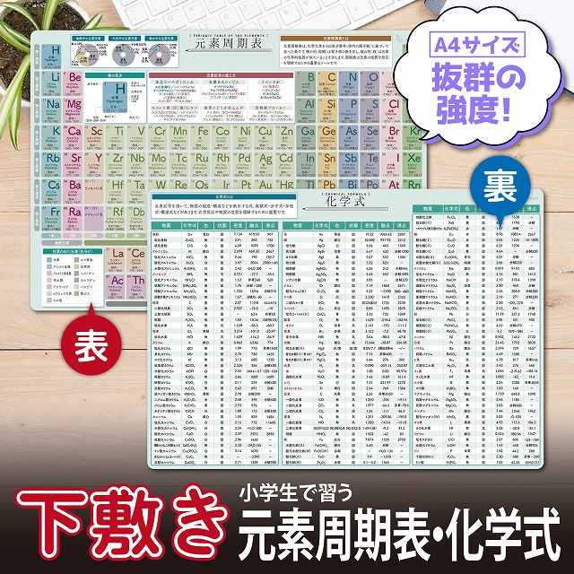 元素周期表と化学式を表裏にまとめた下敷きです。