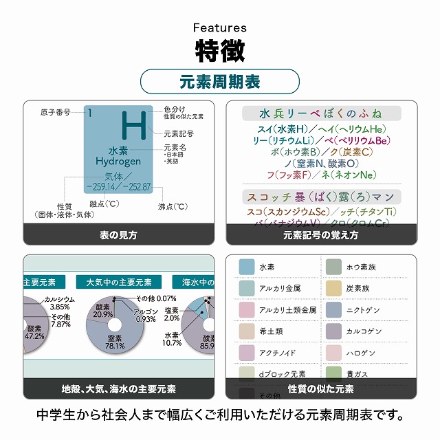 元素周期表では元素の記号・原子番号・名称(日本語と英語)・質量・状態・融点・沸点・使用例をイラスト付きで掲載しています。視覚的に整理されており、必要な情報をひと目で把握できます。