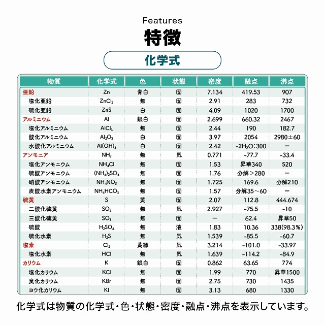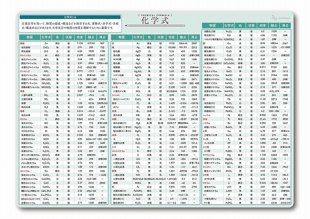 化学式では、覚えておきたい化学式126個を収録。物質の化学式・色・状態・密度・融点・沸点を掲載しています。化学式の理解を深めることで、化学の学習がより楽しく、また基礎理解を効果的に進められます。