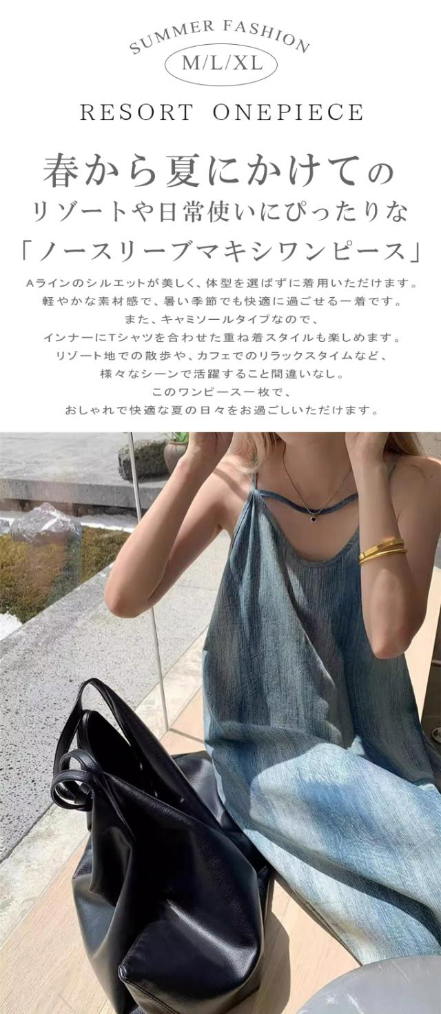 春から夏にかけてのリゾートや日常使いにぴったりな 「ノースリーブマキシワンピース」 Aラインのシルエットが美しく、体型を選ばずに着用いただけます。 軽やかな素材感で、暑い季節でも快適に過ごせる一着です。 また、キャミソールタイプなので、 インナーにTシャツを合わせた重ね着スタイルも楽しめます。 リゾート地での散歩や、カフェでのリラックスタイムなど、 様々なシーンで活躍すること間違いなし。 このワンピース一枚で、おしゃれで快適な夏の日々をお過ごしいただけます。 ※モニター環境により多少色合いが異なりますので、予めご了承くださいませ |
