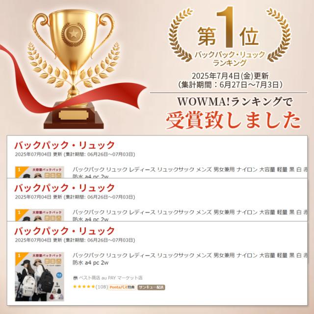 【WOWMA!1位獲得】バックパック リュック レディース リュックサック メンズ 男女兼用 ナイロン 大容量 軽量 黒 白 赤 防水 a4 pc 2way 韓国 人気 おしゃれ かわいい 送料無料 シンプル 通学 デート 旅行 軽い 大人 中学生 高校生 学生 大きめ 可愛い 通勤 収納