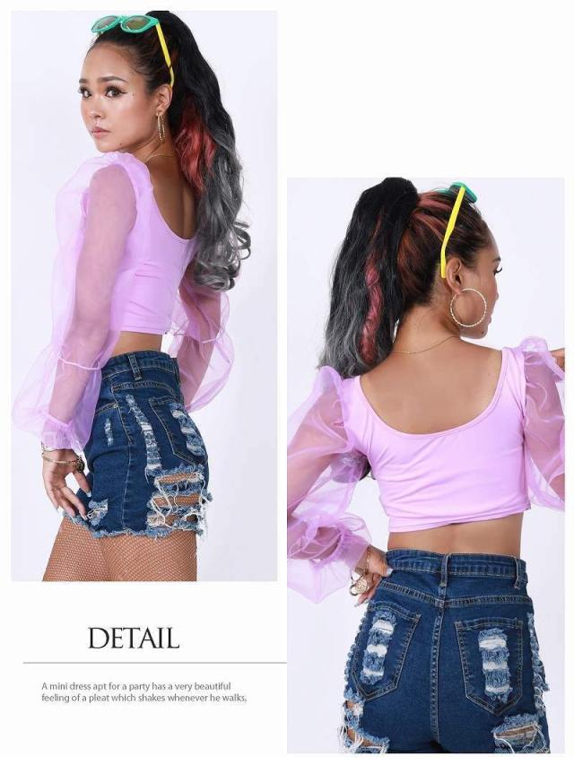 ☆タイトなへそ出し短めの丈感と二の腕のラインを拾わないゆったりとしたシアー素材のバルーンスリーブがメリハリの効いた長袖トップス。
