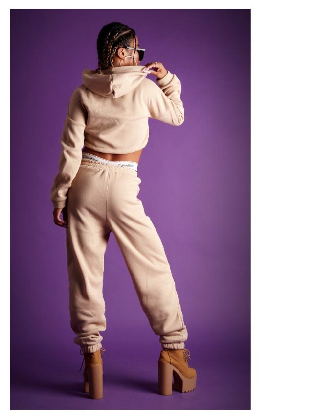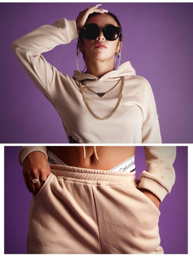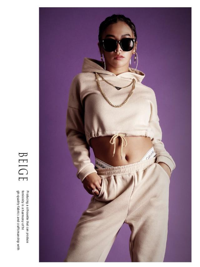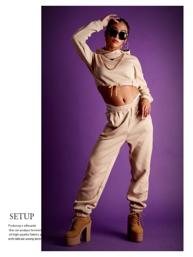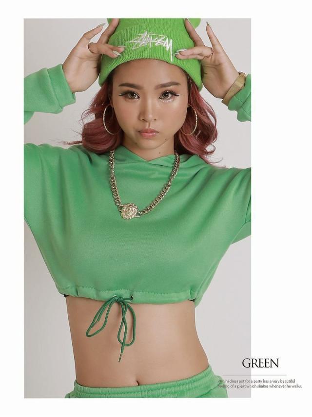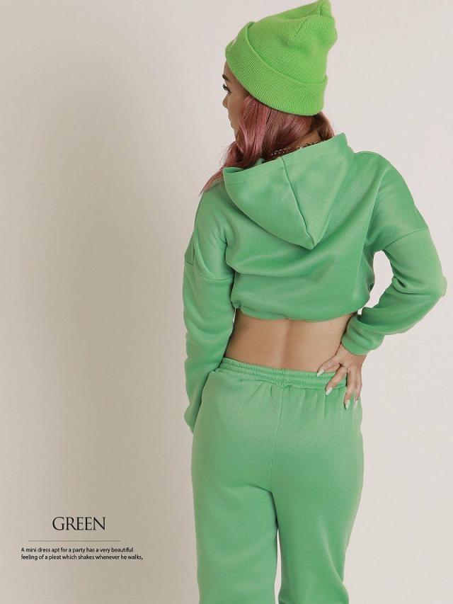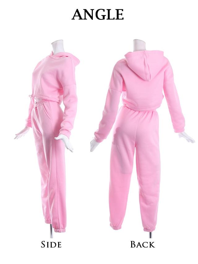 ☆長袖フーディは裾を絞ってスポーティなへそ出しスタイルが楽しめちゃう、ショート丈のパーカーとゆるだぼロングパンツの2点セット。