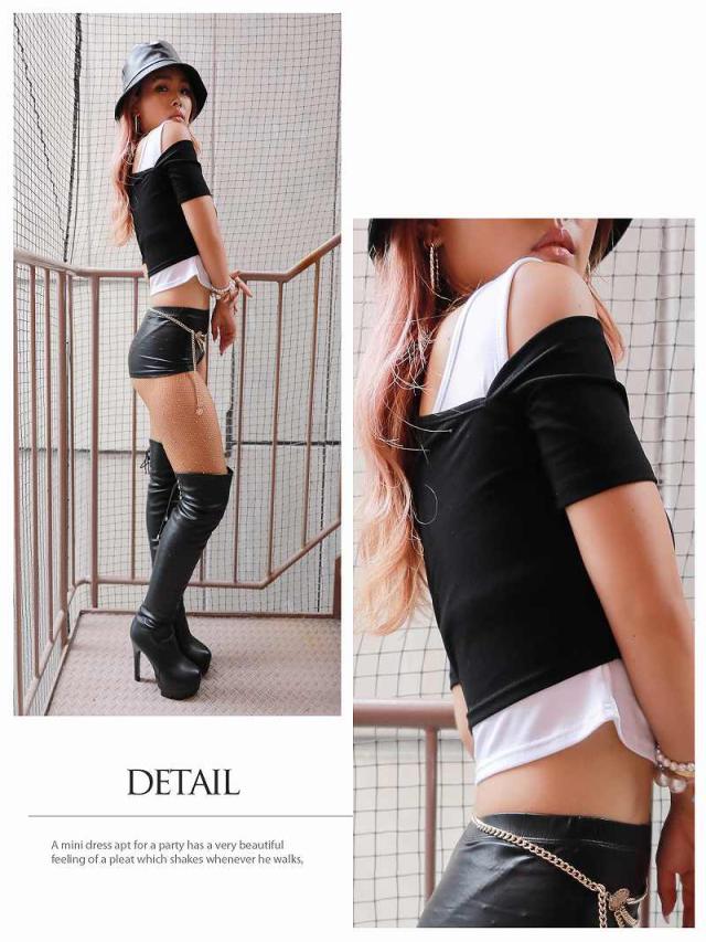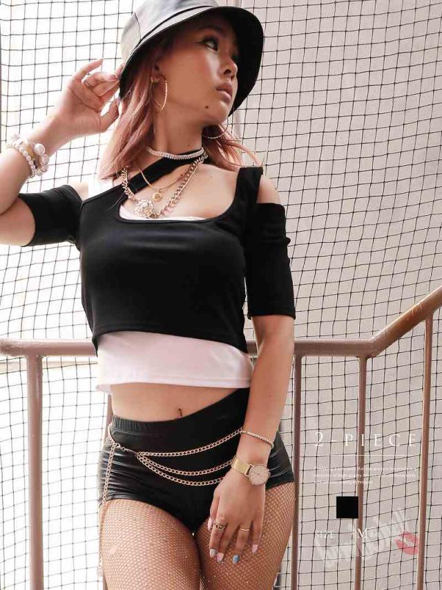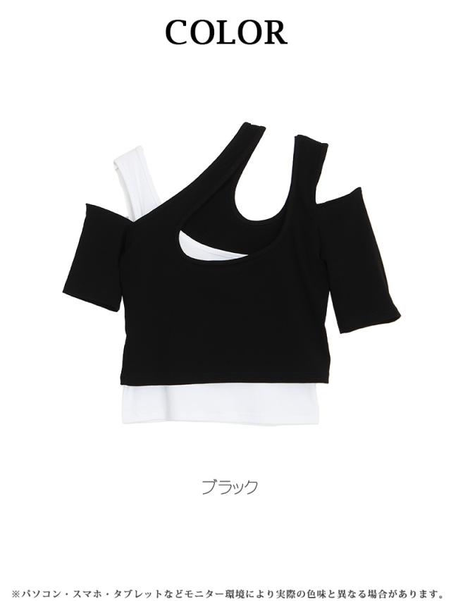 ☆カットアウト風のレイヤードトップスはこれだけでインパクト大!ショート丈だからお腹見せがクールでスタイルがよく見えちゃう。
