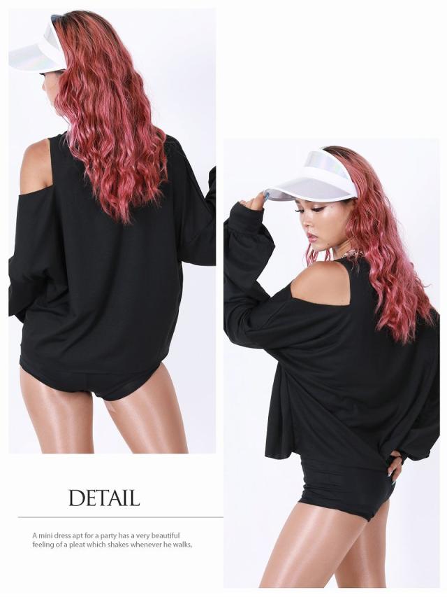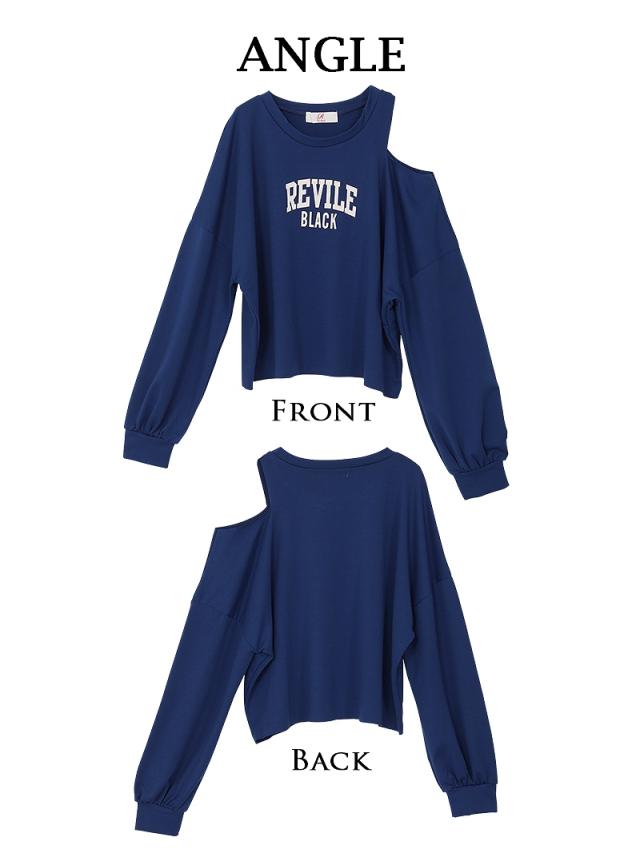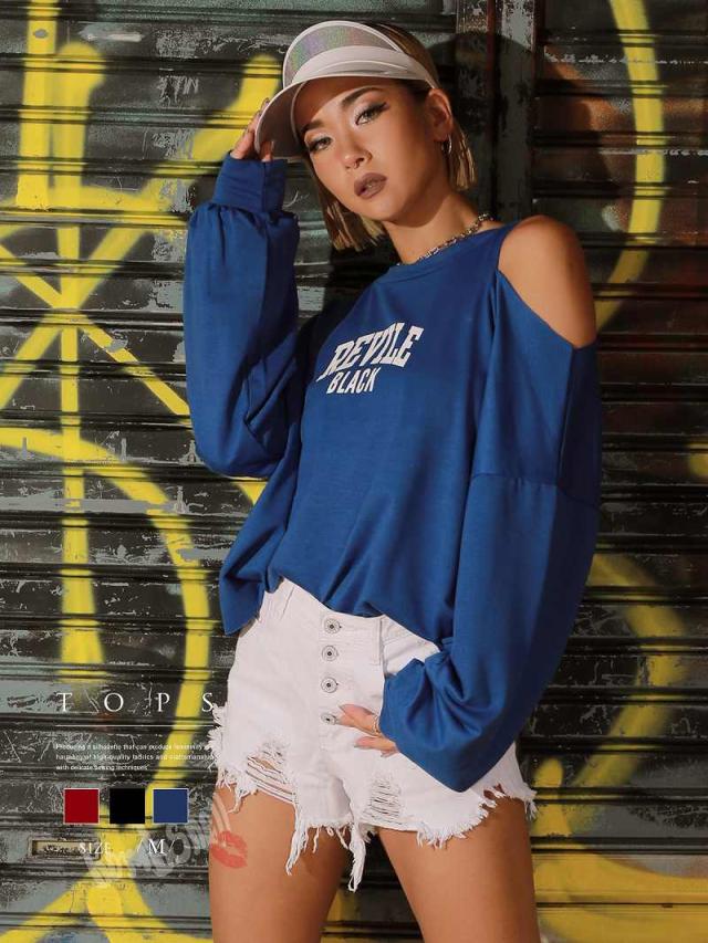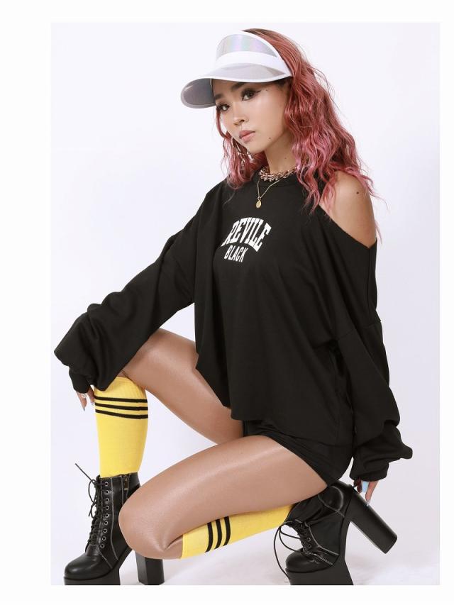 ☆シンプルなロゴプリントがアクセントのオープンショルダーカットソーは着回しやすくダンサーさん必見。