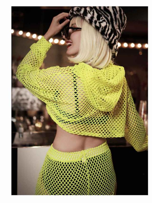 ☆メッシュデザインのショート丈でシースルーな透け感がセクシーなのでダンス衣装としてもオススメのフード付きパーカー。