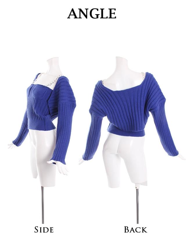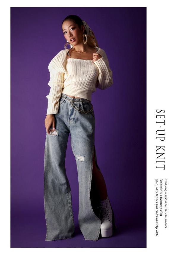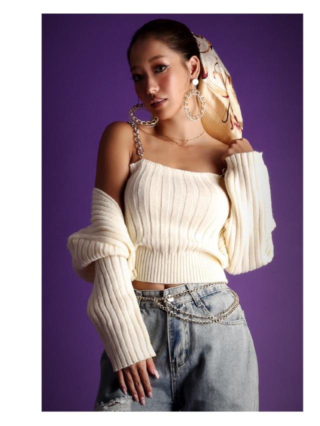 ☆ゴツめのチェーンストラップとコルセット風編みが超COOLでカッコいいビスチェとカーディガンのセットアアップ。
