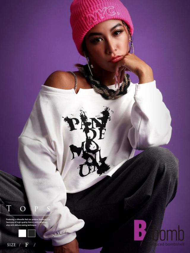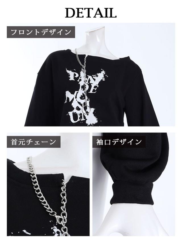 ☆エッジの効いたシルバーチェーン付きのロックプリント長袖トレーナー。