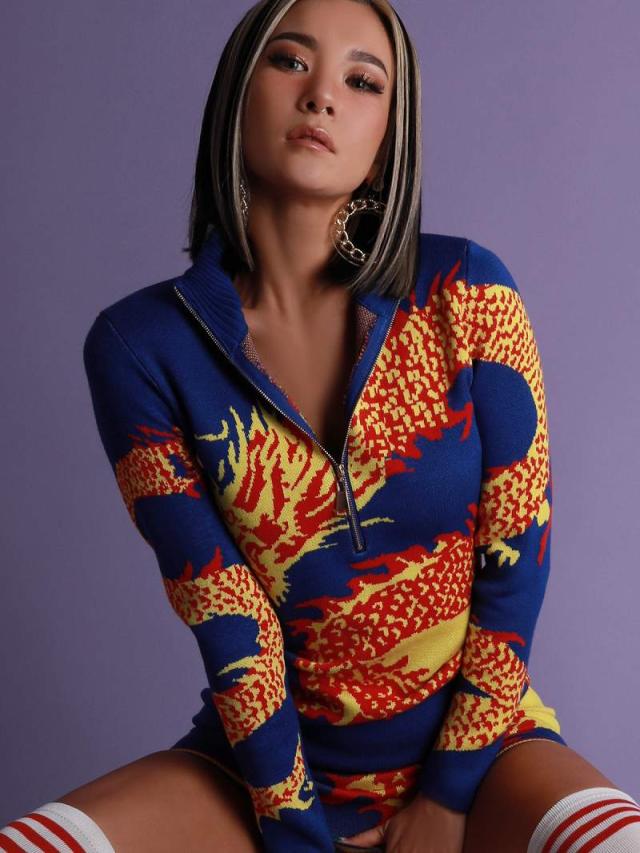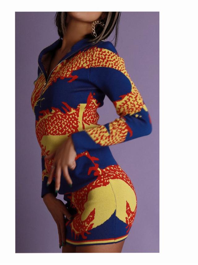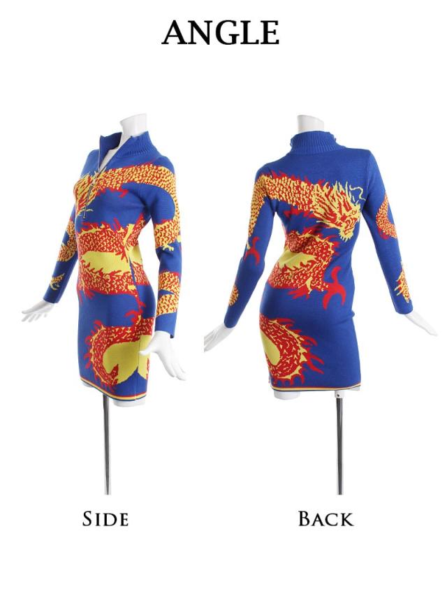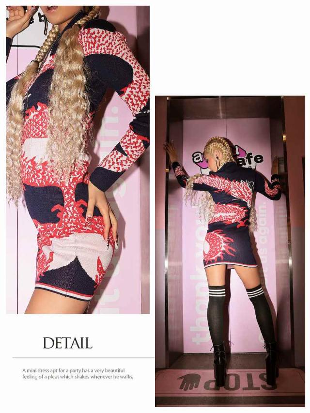 ☆360度まわりの視線を掴んで離さないタイトワンピースは、ド派手なドラゴン柄が超絶COOOLな長袖リブニットワンピースで他と一味違う存在感とセクシーさをアピール!