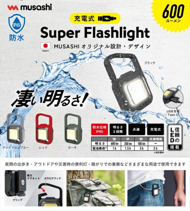 | 小型+凄い明るさ+防水。 作業灯やアウトドアに。 MUSASHI オリジナル設計・デザイン。 信頼のLEDを搭載。 手のひらサイズの本体から投光器のような強力な光を放ちます。 防水仕様[保護等級IP65]で雨や埃に強いタフ仕様。 明るさは3段階に切り替え可能。 フラッシュ(点滅)機能も搭載しています。 夜間の出歩き・アウトドアや災害時の便利灯・暗がりでの作業などさまざまな用途で使用できます。 強力マグネットとクリップ、カラビナフック付きで様々なシーンでお使いいただけます。 充電式(USB Type-C)で電池の交換不要。 繰り返し使用できます。 充電用コード付き。 |