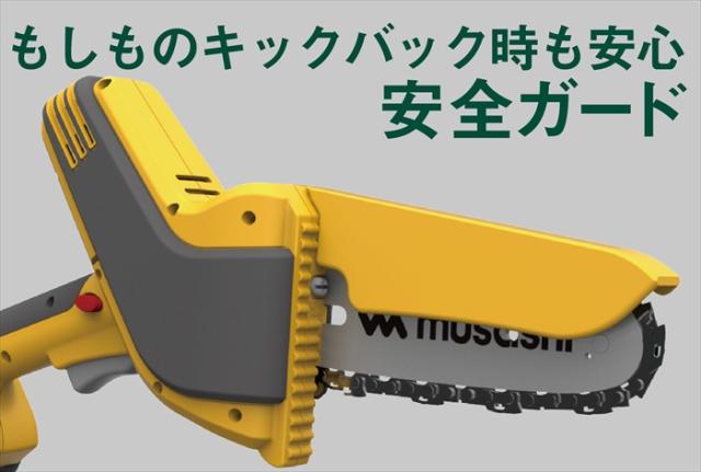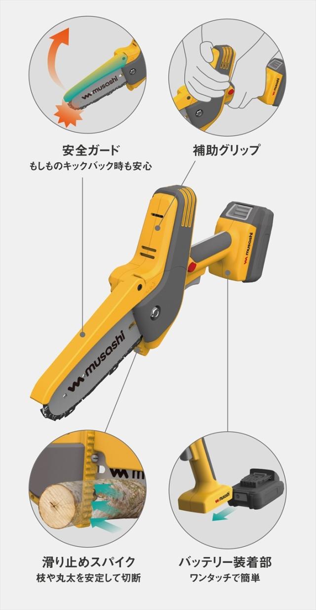 | 低木から高木まで太枝が切れる、ポール付き小型チェーンソー。 高い木にはポールチェーンソー、手元の太枝にはハンディチェーンソー。 伸縮自在で高い木の太枝も楽に切ることができます。 最大12cmまで切断できるパワフル切断。 切断時に固定しやすい滑り止めスパイク。 もしものキックバック時も安心、安全ガード。 1回の充電で180本切断可能です。(※満充電時、3.8cm生木の場合) |