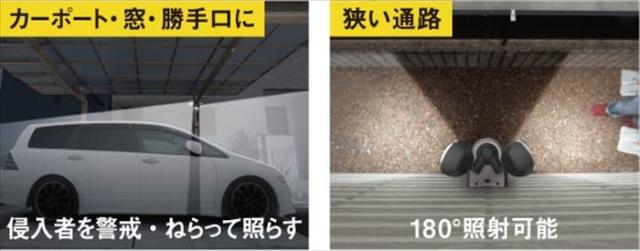 狭い通路も180°照射できるので、カーポート・窓・勝手口と合わせて、しっかり対策しましょう。