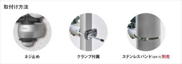 ネジ取り付け、クランプ取り付け(1セット付属)、ステンレスバンド(別売り:SP-7)、市販バンド対応