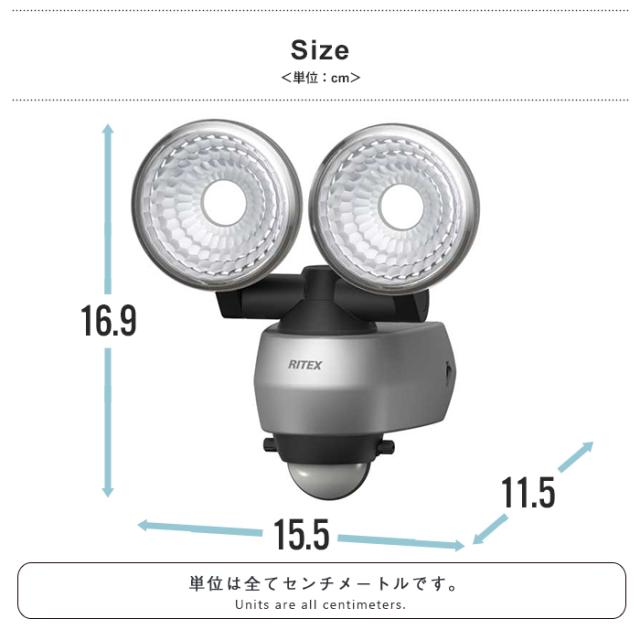 | ・ 電源:AC100V ・ 消費電力:[点灯時]約15W、[点灯時(常夜灯)]2.5W、[待機時]1.0W以下 ・ 電球:高輝度白色LED 7.5W×2(※LED設計寿命:40,000時間) ・ 明るさ:[点灯時]1300ルーメン、[常夜灯]130ルーメン ・ ライト可動角度:左右各90°、下45° ・ センサー探知範囲:[角度]最大約140°[距離]最遠約8m ・ センサー点灯時間調整機能:約5秒~5分(無段階) ・ センサー点灯切替機能:昼(周囲が明るくても暗くても点灯)/夜のみ(周囲が暗い時のみ点灯) ・ 常夜灯モード:周囲が暗くなると常夜灯(明るさ10%)が点灯、周囲が明るくなると消灯 ・ センサー探知方式:焦電型赤外線センサー ・ コード長:3m(ACタイプ) ・ 24時間警戒灯:待機時センサー部赤色LED点滅 ・ クランプ取り付けサイズ:[厚み]約1.5〜10cm、[パイプ径]約Φ3〜8.5cm |