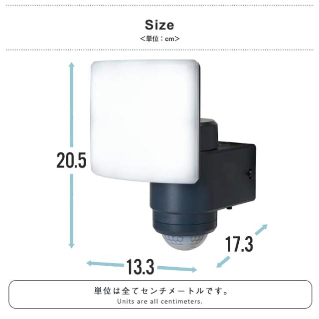 | ・ 電球:18W 高輝度白色 LED (【全光束】2000ルーメン、【常夜灯】100ルーメン(弱) / 200ルーメン(中) / 300ルーメン(強) 、【設計寿命】40,000時間) ・ 電源/電圧:AC100V 50/60Hz ・ 消費電力:【点灯時】20W (全灯) / 1.5W (常夜灯弱) / 2W (常夜灯中) / 2.5W (常夜灯強) 、【待機時】1W 以下 ・ 常夜灯切替機能:OFF / 弱 / 中 / 強 ・ センサー:【探知方式】焦電型赤外線センサー、【探知範囲】最大 240° 最遠 12m (取り付け高さ2.5m時) ・ 探知距離切替機能:短4m / 中8m / 長12m ・ 点灯時間設定:約5秒~約5分 ・ 点灯切替機能:昼… 周囲が明るくても暗くても点灯、夜… 周囲が暗い時のみ点灯 ・ 電源コード:約3m ・ クランプ取り付けサイズ:【厚み】 最小15mm~最大100mm、【パイプ径】最小30mm~最大75mm |