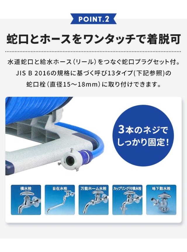 | モダンフォルムでしっかりボディの50mホースリール。 ◇クイックノズルR ワンタッチで通水・止水ができ、通水したまま水流調節が可能。5つの水流が選べます。 ◇ロータリーコネクター ホースのねじれを防ぎ、ノズルの脱着も簡単にできます。 ◇耐圧マリンブルータイプホース 中黒ホースにより紫外線をカット、藻の発生を抑えノズルの目詰まりを防ぎます。 ◇コネクターエルボ ホースのねじれ・折れ癖を防ぎます。ワンタッチで脱着できるので、移動・収納に便利。 ◇蛇口プラグセット 蛇口と給水ホースのつなぎ役。3本のねじでしっかりと固定します。ワンタッチで脱着もできます。 |