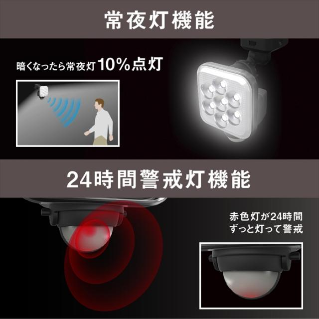 ・ 昼夜切り替え機能:あり 〈昼〉周囲が明るくても暗くても点灯/〈夜〉周囲が暗い時のみ点灯/〈常夜灯〉周囲が暗くなると常夜灯(明るさ10%)が点灯し周囲が明るくなると消灯