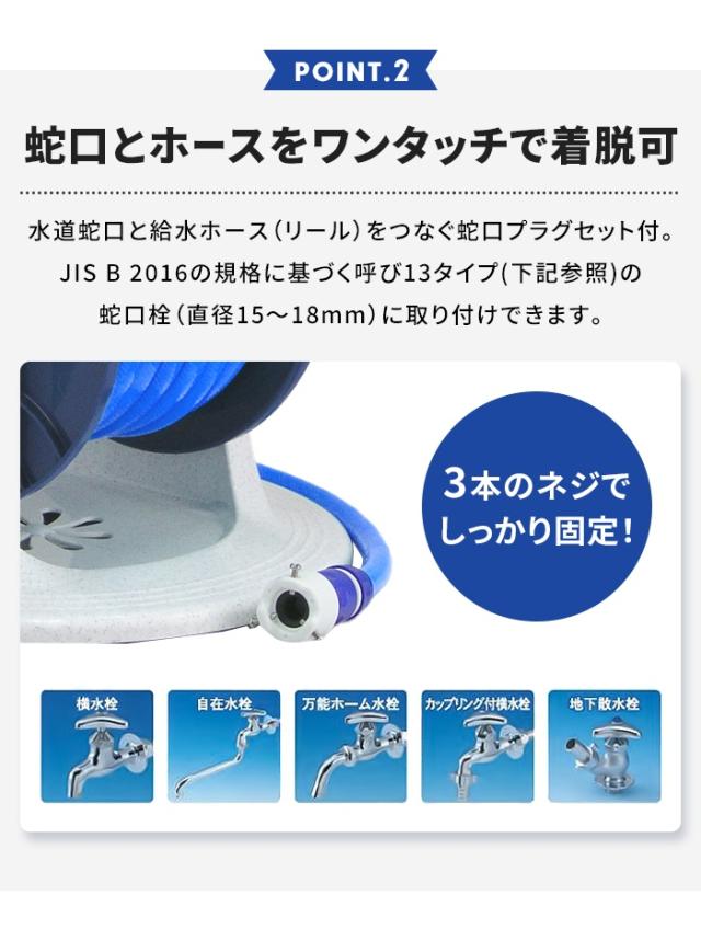 | 曲線フォルムと機能性を装備した20mホースリール。 ◇クイックノズルR ワンタッチで通水・止水ができ、通水したまま水流調節が可能。5つの水流が選べます。 ◇ロータリーコネクター ホースのねじれを防ぎ、ノズルの脱着も簡単にできます。 ◇耐圧マリンブルータイプホース 中黒ホースにより紫外線をカット、藻の発生を抑えノズルの目詰まりを防ぎます。 ◇コネクターエルボ ホースのねじれ・折れ癖を防ぎます。ワンタッチで脱着できるので、移動・収納に便利。 ◇円形ステップ台 どこからでも踏むことができる便利な足踏み台。ホースを引き出す時にホースを避けて踏むことができるので、衣類を汚さず使用できます。 ◇蛇口プラグセット 蛇口と給水ホースのつなぎ役。3本のねじでしっかりと固定します。ワンタッチで脱着もできます。 |