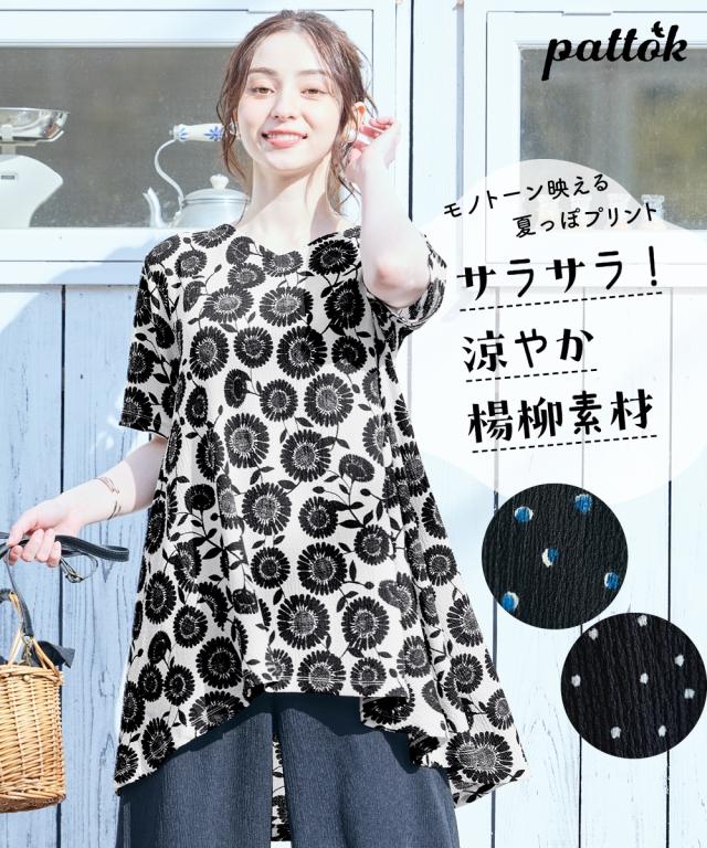 チュニック レディース 涼しいサラサラ プリント カットソー 楊柳Aライン ロング丈 夏 体型カバー お尻隠れる | L/LL/3L | ニッセン nissen