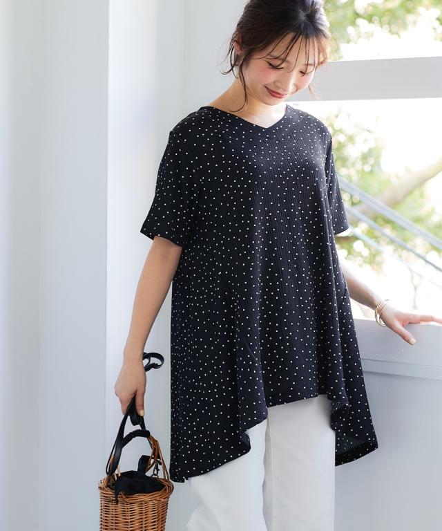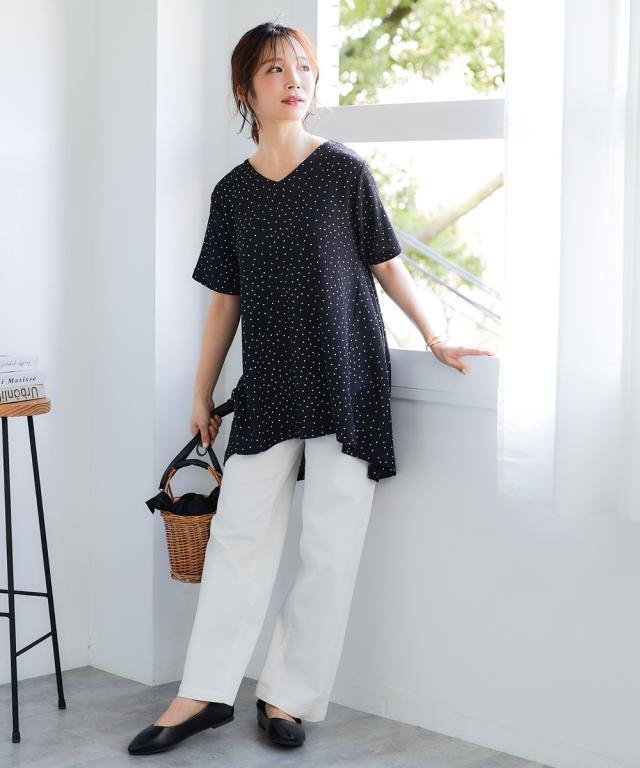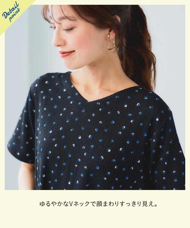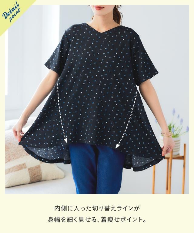 もう、着るものに悩まない!朝、迷わずサッと着るだけでおしゃれ見え。毎年スマイルランドで人気の涼やか楊柳アイテム。 夏の涼しげ素材で汗をかいてもさらさら快適な楽ちん可愛いチュニック。涼しげな楊柳素材で、一日中快適に過ごせるから、等身大の自分で素敵になれる魔法の一枚。 ■デザイン 気になる体型をふんわりカバーしてくれるAラインシルエットのロング丈チュニック。ゆったりとした着心地で、お腹周りやヒップラインを自然に隠してくれます。Vネックデザインは、首元をすっきりと見せ、抜け感をプラス。総柄プリントがシンプルな中にも遊び心を演出。楊柳素材の自然なシワ感が、こなれた印象を与えます。 ■素材 やわらかな楊柳にプリントをのせました。ポリエステルをメインに使用した楊柳素材は、サラサラとした肌触りで、汗ばむ季節も快適に過ごせます。軽くてシワになりにくいので、お手入れも簡単。洗濯機で洗えるから、毎日気軽に着用できます。 ■おすすめのスタイリング チュニックの柄を引き立てる、シンプルなボトムスとのコーディネートがおすすめです。画像のように、白のパンツと合わせて爽やかに着こなしたり、黒やブラウンのワイドパンツと合わせて大人っぽく着こなすの