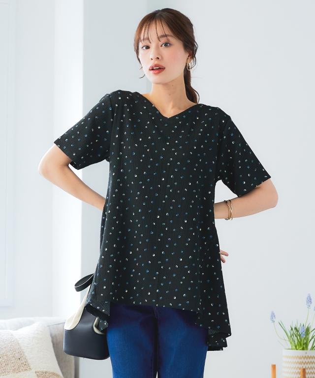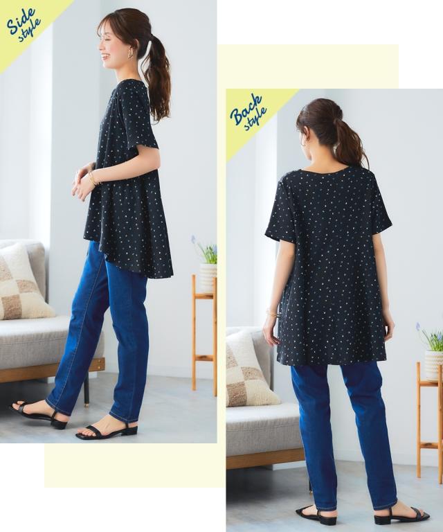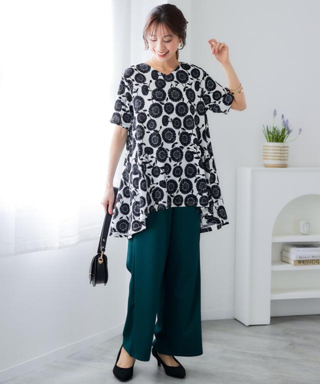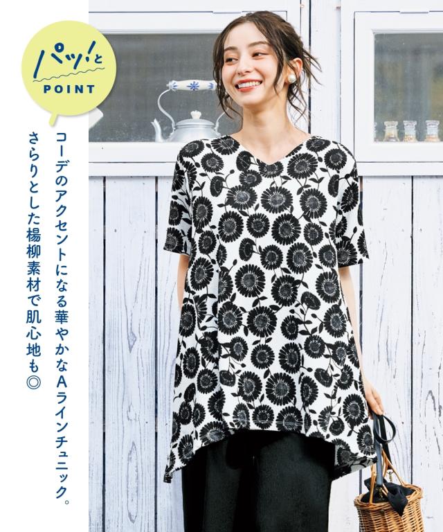 もう、着るものに悩まない!朝、迷わずサッと着るだけでおしゃれ見え。毎年スマイルランドで人気の涼やか楊柳アイテム。 夏の涼しげ素材で汗をかいてもさらさら快適な楽ちん可愛いチュニック。涼しげな楊柳素材で、一日中快適に過ごせるから、等身大の自分で素敵になれる魔法の一枚。 ■デザイン 気になる体型をふんわりカバーしてくれるAラインシルエットのロング丈チュニック。ゆったりとした着心地で、お腹周りやヒップラインを自然に隠してくれます。Vネックデザインは、首元をすっきりと見せ、抜け感をプラス。総柄プリントがシンプルな中にも遊び心を演出。楊柳素材の自然なシワ感が、こなれた印象を与えます。 ■素材 やわらかな楊柳にプリントをのせました。ポリエステルをメインに使用した楊柳素材は、サラサラとした肌触りで、汗ばむ季節も快適に過ごせます。軽くてシワになりにくいので、お手入れも簡単。洗濯機で洗えるから、毎日気軽に着用できます。 ■おすすめのスタイリング チュニックの柄を引き立てる、シンプルなボトムスとのコーディネートがおすすめです。画像のように、白のパンツと合わせて爽やかに着こなしたり、黒やブラウンのワイドパンツと合わせて大人っぽく着こなすの