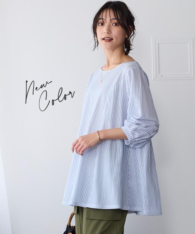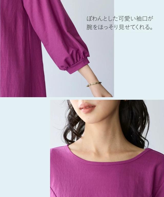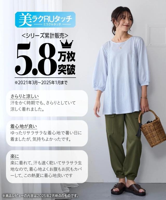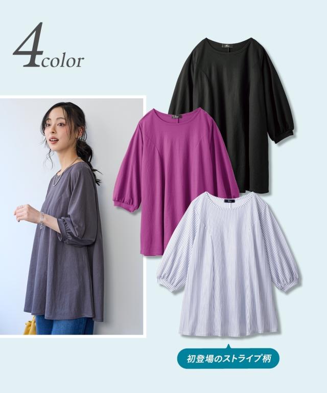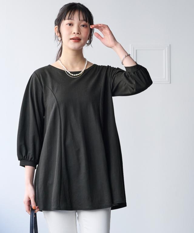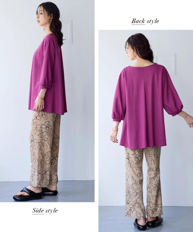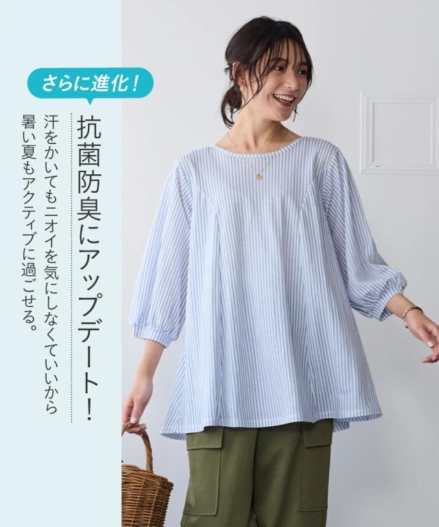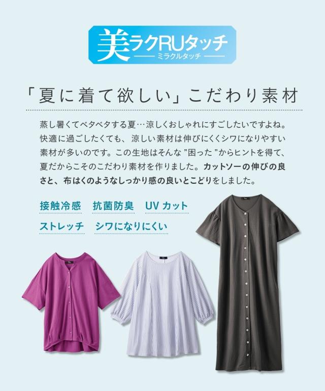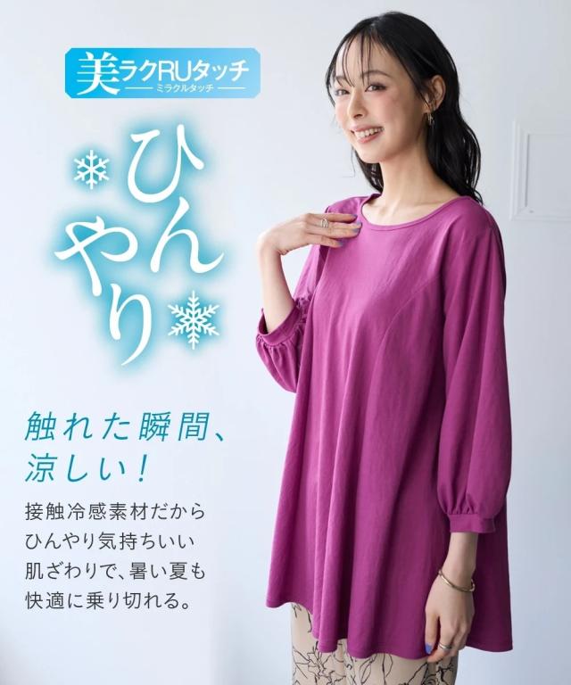 毎日着たくなる、涼しい一着。 こんなカットソーが欲しかった!!伸縮性があって楽なのに綺麗見え!新感覚ひんやりカットソーシリーズがさらに夏を快適にすごせるようにバージョンアップして新登場! ■デザイン 立体的なフレアシルエットがきれいな1枚。お尻がすっぽりかくれるのでふんわり体型をカバーしてくれます。ふんわりした袖で女性らしさをプラス。七分袖なので気になる腕をカバーしてくれます。 ■素材 布はくのようなしっかり感×カットソーのストレッチの良さをいいとこどりした美ラクRU(ハイブリッド)カットソー。着た瞬間ひんやりCOOL TOUCHなのもうれしいこだわり夏素材☆今年はさらに抗菌防臭付き。汗などで気になる臭い対策に UVカットで日差しもシャットアウトしてくれるので真夏のお出かけに便利。 ■おすすめのスタイリング いつものパンツと合わせるだけでコーディネートがきまるので便利。丈が長すぎないのでボリュームのあるロングスカートやワイドパンツとも相性 きちんと見えるのでお出かけにピッタリ。シンプルなデザインなので着回しがきいて便利です