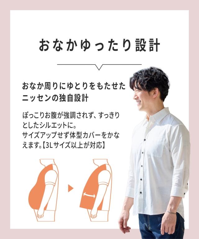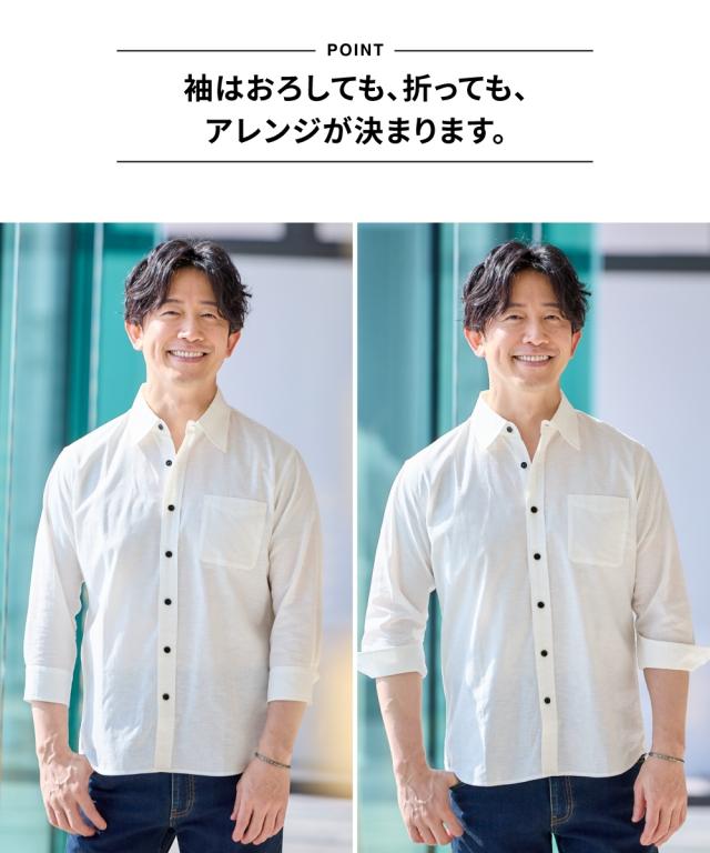 夏に嬉しい麻混素材を使用したレギュラーカラーのシャツ。7分袖でスッキリとしたシルエットが特徴です。 大きいサイズも展開しております。(M/L/LL/3L/4L/5L/6L/8L/10Lサイズ) ■デザイン 着こなしに重宝するカラーリングで袖をロールアップしてもスタイリッシュに着こなせます。 そのままでもよし、アウターのインにも使える1枚です。 3L以上のサイズにはお腹まわりにゆとりを持たせたこだわりの設計で、 『肩幅・着丈・袖丈はジャストサイズなのにお腹まわりが少し窮屈・・』と言うお悩みにも解決! 1サイズ上げる事なくスッキリ着こなせます。 ■おすすめのおしゃれスタイリング 細身のテーパードパンツやスキニーパンツに合わせるコーディネートがおすすめ。