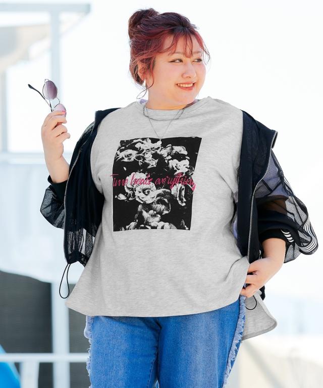 大きいサイズ 5分袖ビッグシルエットプリントチュニックTシャツ(吸汗速乾)(薄手素材)