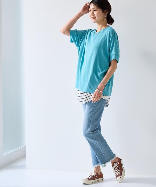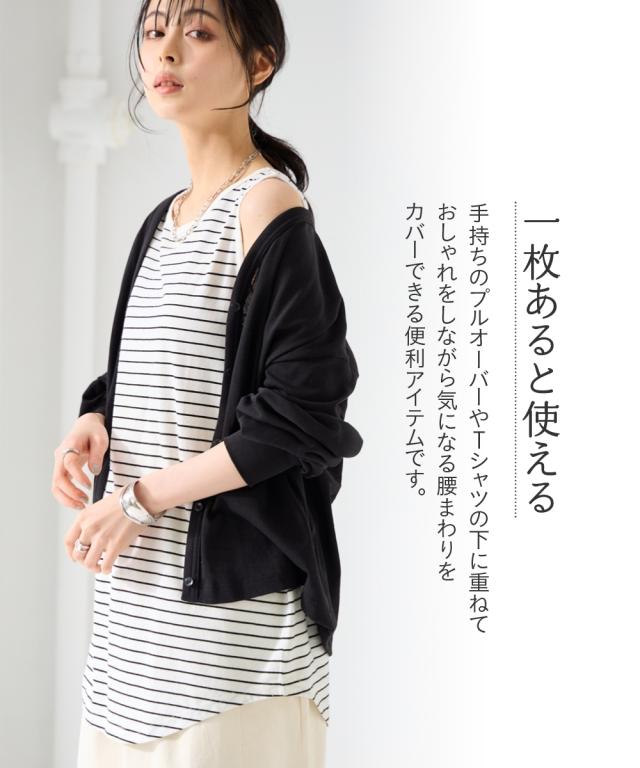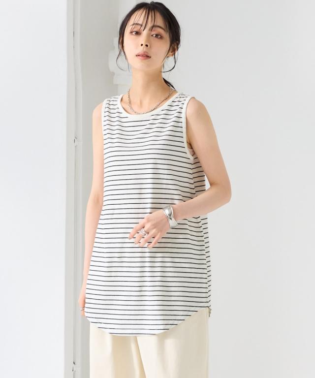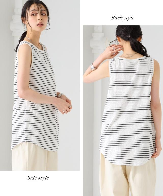 1枚あると便利!重ね着することでいつものスタイリングがおしゃれに進化。綿100%だから肌に優しく暑い夏でも快適に過ごせます。 ■デザイン シンプルなタンクトップ型。裾がラウンドになっているのが旬。ロングでも重くならず抜け感があってこなれた雰囲気に。気になる下半身をカバーしてくれて安心です。細いボーダーなので大人っぽく着ていただけてコーデのポイントにも ■素材 肌触りの良い綿100%。汗を吸ってくれて肌触りも良いので暑い夏に最適 ■おすすめのスタイリング 1枚はもちろん、上からカーディガンやパーカーを羽織ったり、プルオーバーの裾から出してもかわいい。丈が長めなのでお手持ちのプルオーバーの長さを長くできて体型カバーにもってこい。年中、着まわせるデザインなので便利。