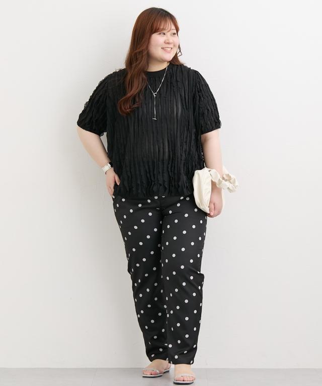 品質:[本体・リブ部]ポリエステル95%・ポリウレタン5% 薄手の生地を使用しておりますのでインナーにご注意ください。 透け感:やや透ける ※色によって透け感が異なる場合があります。淡色カラーはベージュ系インナー着用をおすすめします。 伸縮性:あり 生地の厚み:薄い 光沢感:なし 裏地:なし ポケット:なし 季節:夏 シルエット:普通 原産国:中国製 備考:手洗い ※単位:cm ※仕立てサイズとは、実際に商品を測った時のサイズのことです。 ※サイズの誤差は多少発生します。
