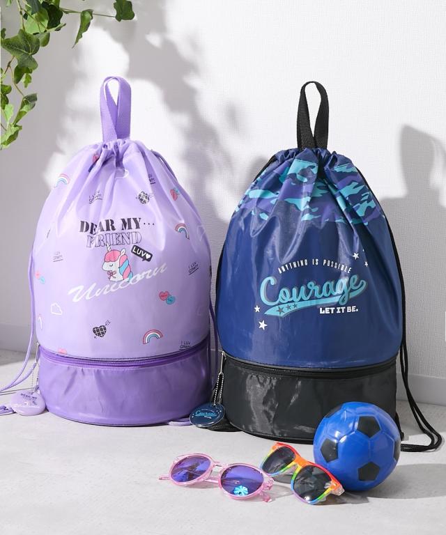 軽くて使いやすい ボンサックタイプのビーチバッグ 別々に収納可能な便利な2ルーム仕様 ユニコーン柄と迷彩柄でご用意しました☆ ■デザイン ・別々に収納可能☆便利な2ルーム仕様 ・裏にお名前が書けるキーホルダータイプのチャーム付き ・持ち手があって使いやすい ・プリント柄は人気のユニコーンと迷彩柄 ■素材 ・軽くて持ち運びしやすい薄手のポリエステル素材