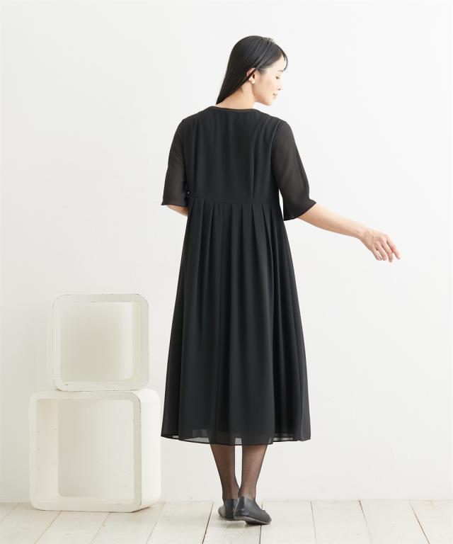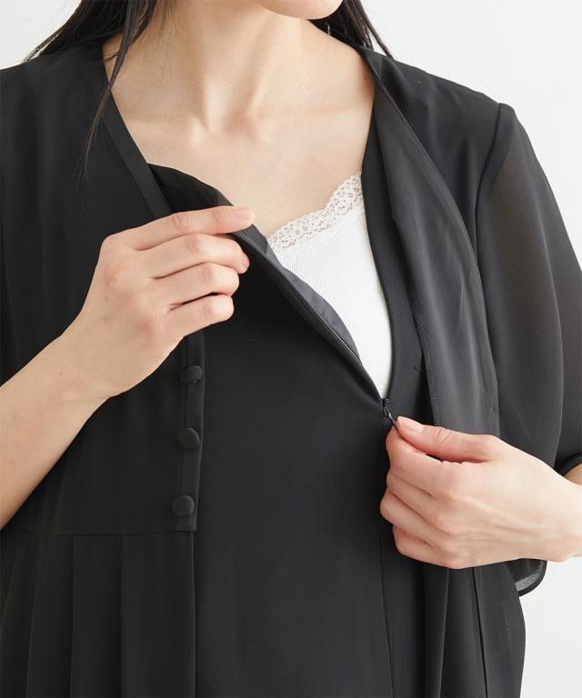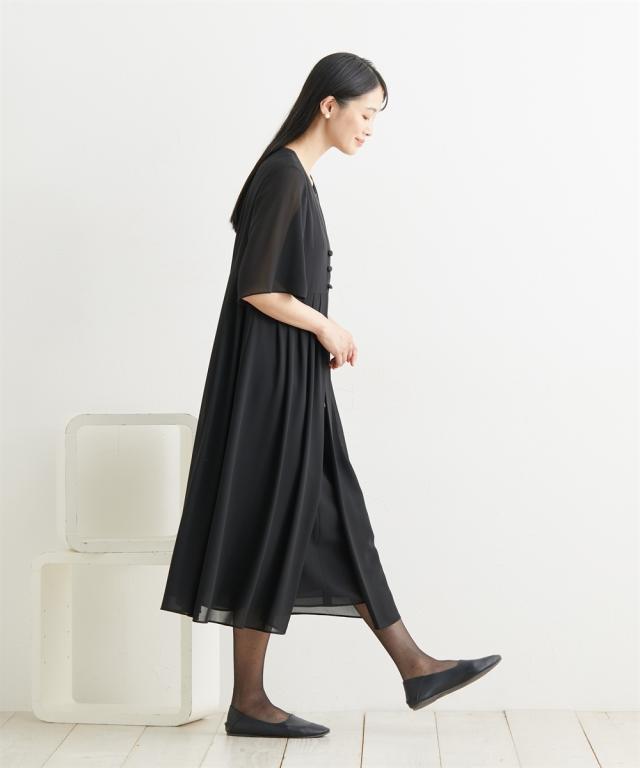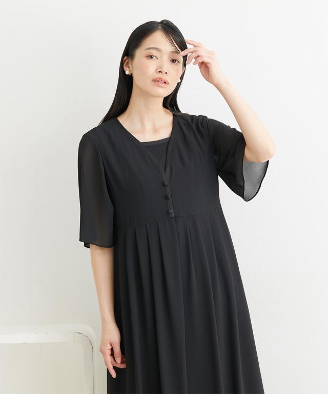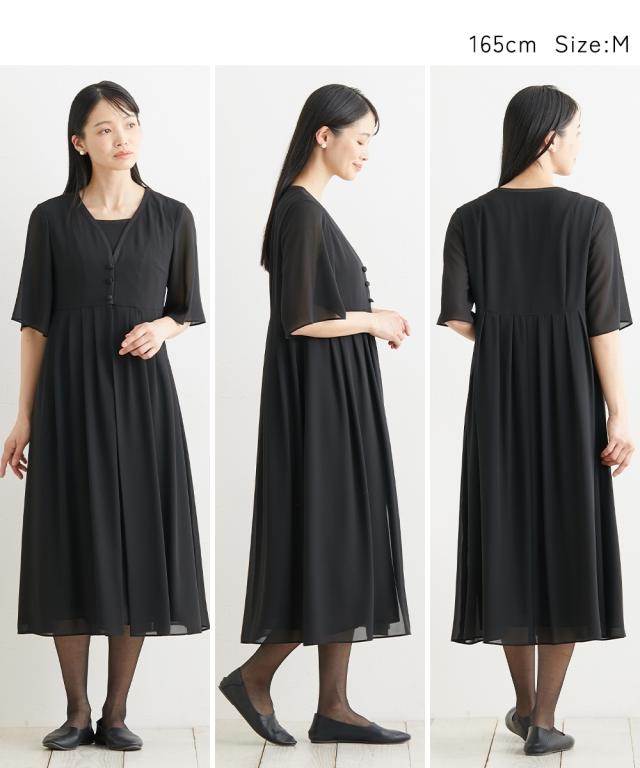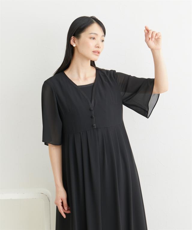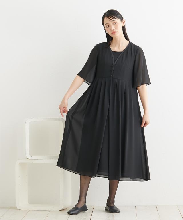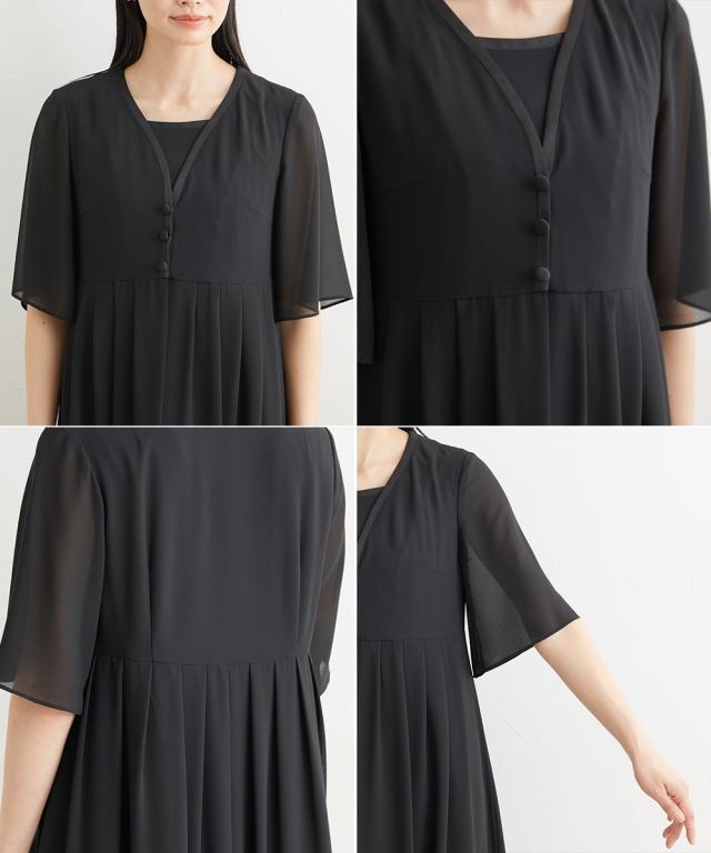 喪服 礼服 ブラックフォーマル レディース 洗える防しわ 前開き 重ね着風 ワンピース 有 〔Neina〕 夏 冠婚葬祭 フォーマルスーツ | M/L | ニッセン nissen