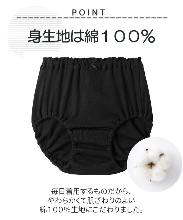 暑い季節にオーバーパンツは履きたくない! そんなお子様におすすめのオーバーパンツの要らない黒無地ショーツ☆彡 <特徴> ■身生地は綿100% 毎日身につけるものだから、やわらかくて肌ざわり抜群の綿100%の生地にこだわりました。 ■ウエスト・足口のゴムが直接肌にあたらない ゴムを身生地にくるんでいます。 だから直接ゴムが肌にあたることがありません。 ■ウエスト・足口がよく伸びます 身生地にくるんでいるゴムは、やわらかく、伸縮性バツグンです。 締め付け感がないので、ゴムの苦手なお子様にもおすすめです。 ■すべてが黒色 身生地、マチ部分、リボン部分がすべて黒色。 これなら汚れも気にならないです。 ■リボン付 前後がわかるように前中心にリボンを付けています。 小さなお子様でも前後がわかるのでうれしいですね。