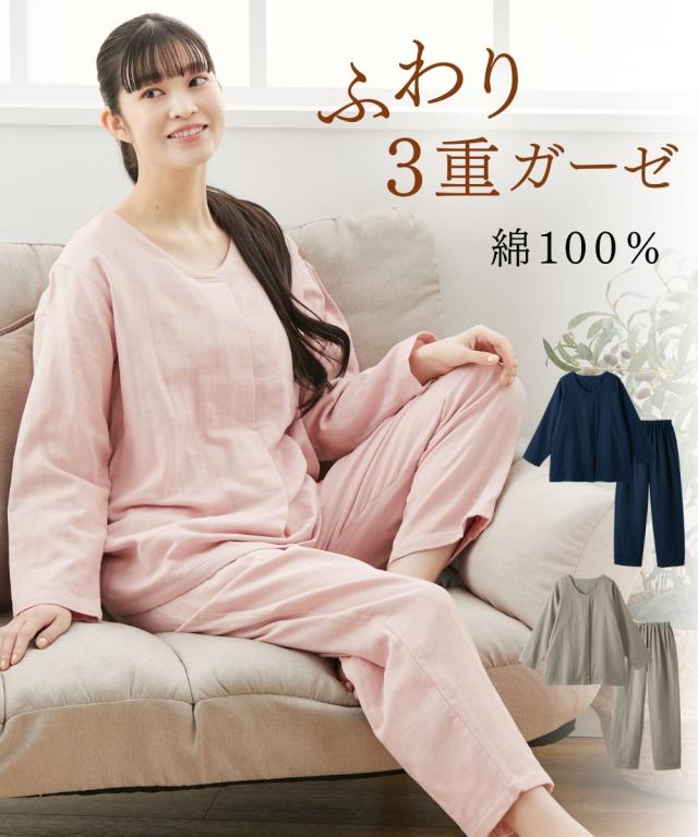 パジャマ 上下セット レディース 3重ガーゼ綿100% ルームウェア 春 秋 冬 セットアップ 部屋着 女性 | M/L | ニッセン nissen