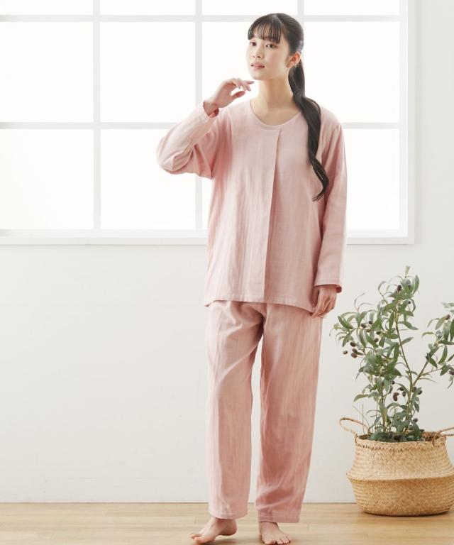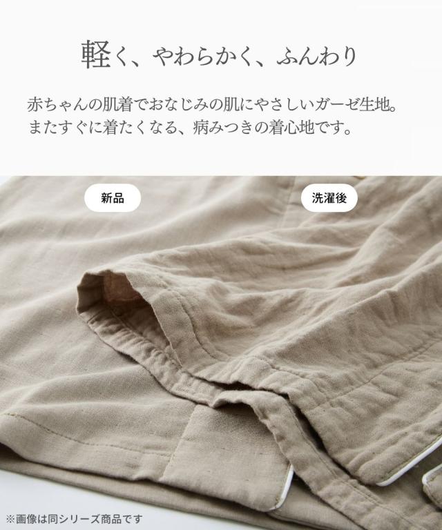 ☆寝る時こそ選びたい、肌にやさしい綿100%パジャマ&ルームウェア☆ 軽く、やわらかく、ふんわり。 やさしい肌触りの綿100%ガーゼ素材を3枚重ねに。 空気の層を作ることで通気性もよく蒸れにくい。 また、保温性が高くなることであたたか。 1年を通して長く着用いただけるパジャマです。 ガーゼは洗うほどにやわらかく、その風合いを増していきます。 またすぐ着たくなる、病みつきの着心地です。 【おすすめポイント】 ■やわらかな3重ガーゼ 綿100%のやわらかなガーゼ生地を3枚重ねて1枚の生地に。 洗うほどにふんわりとやわらかくなり、肌になじむようなやさしい着心地です。 重ねられた生地と生地の間に空気の層ができ、通気性、吸水性、吸湿性に優れています。 保温性がありながらも、蒸れずに快適です。 ■肌にやさしい天然素材の綿100% 綿は通気性や吸水性に優れており、快適な着心地です。 吸湿性により汗をすばやく吸収してさらりとした着心地を保ち、冬は保温性により暖かい。 1年を通して快適に着用できます。 ■ゆったりシルエットのかぶりタイプ サッと着用できるかぶりタイプ。 ゆったりとしたシルエットで締め付け感なく楽な着心地です。 ■タックデザイン トップスは小技