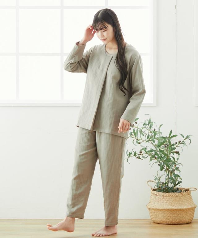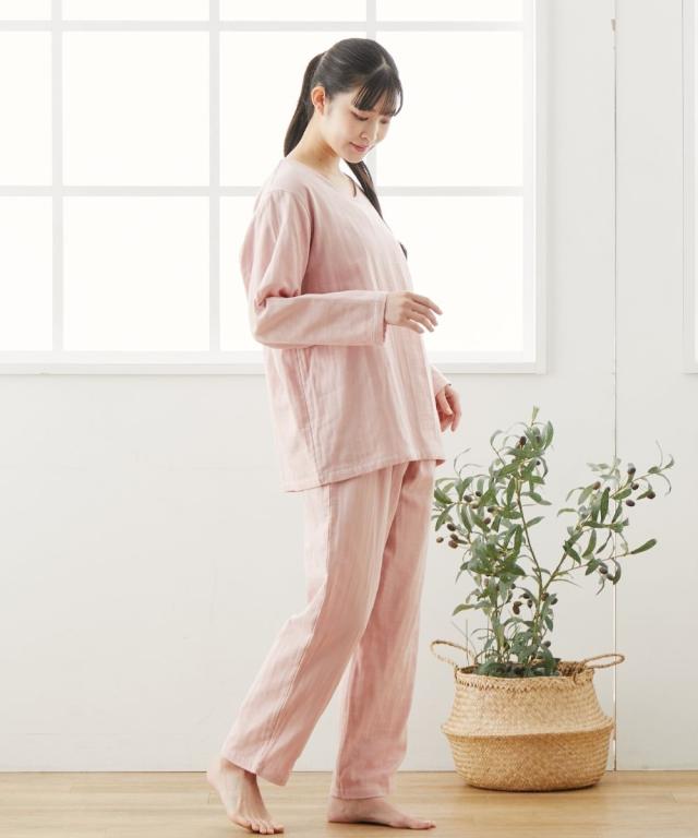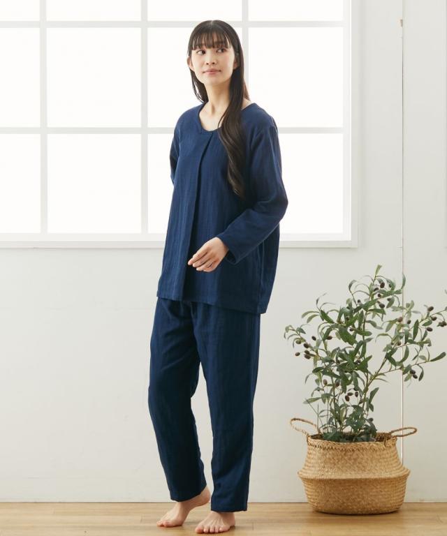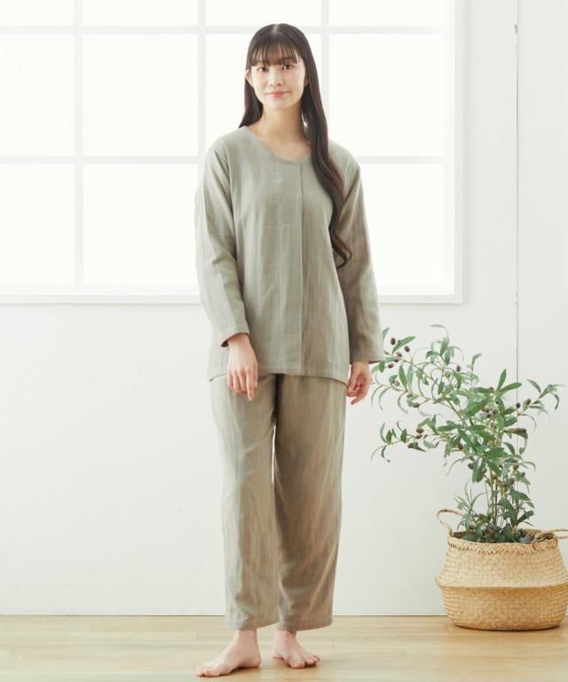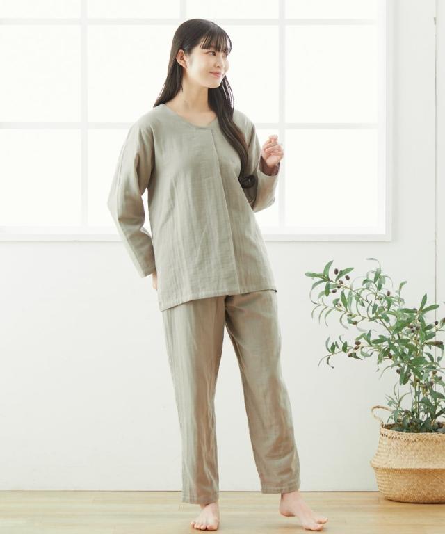 ☆寝る時こそ選びたい、肌にやさしい綿100%パジャマ&ルームウェア☆ 軽く、やわらかく、ふんわり。 やさしい肌触りの綿100%ガーゼ素材を3枚重ねに。 空気の層を作ることで通気性もよく蒸れにくい。 また、保温性が高くなることであたたか。 1年を通して長く着用いただけるパジャマです。 ガーゼは洗うほどにやわらかく、その風合いを増していきます。 またすぐ着たくなる、病みつきの着心地です。 【おすすめポイント】 ■やわらかな3重ガーゼ 綿100%のやわらかなガーゼ生地を3枚重ねて1枚の生地に。 洗うほどにふんわりとやわらかくなり、肌になじむようなやさしい着心地です。 重ねられた生地と生地の間に空気の層ができ、通気性、吸水性、吸湿性に優れています。 保温性がありながらも、蒸れずに快適です。 ■肌にやさしい天然素材の綿100% 綿は通気性や吸水性に優れており、快適な着心地です。 吸湿性により汗をすばやく吸収してさらりとした着心地を保ち、冬は保温性により暖かい。 1年を通して快適に着用できます。 ■ゆったりシルエットのかぶりタイプ サッと着用できるかぶりタイプ。 ゆったりとしたシルエットで締め付け感なく楽な着心地です。 ■タックデザイン トップスは小技