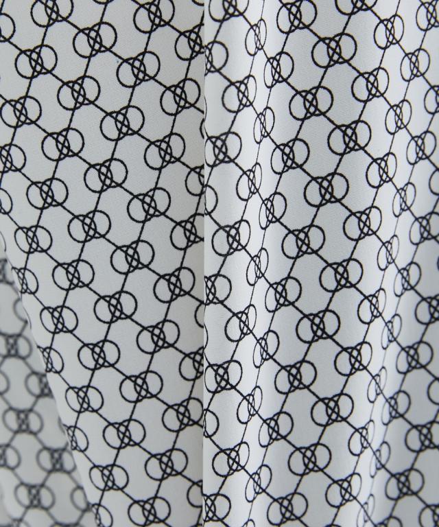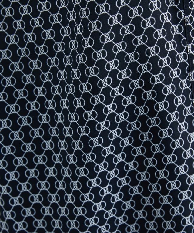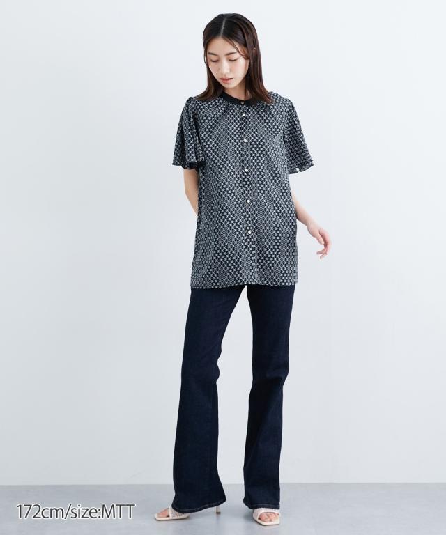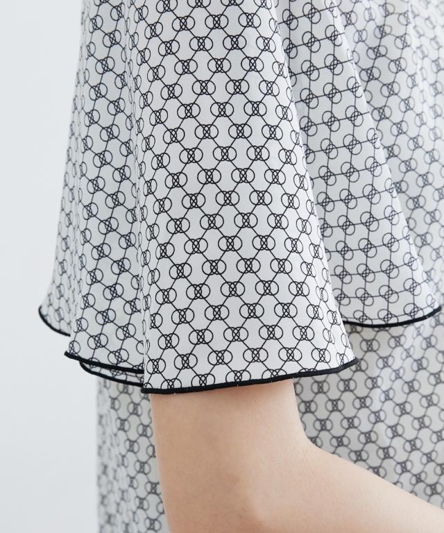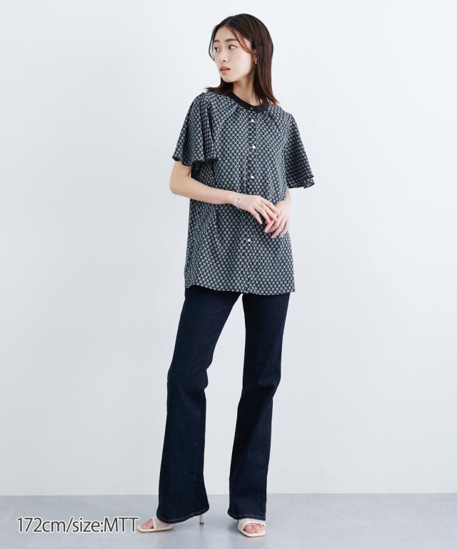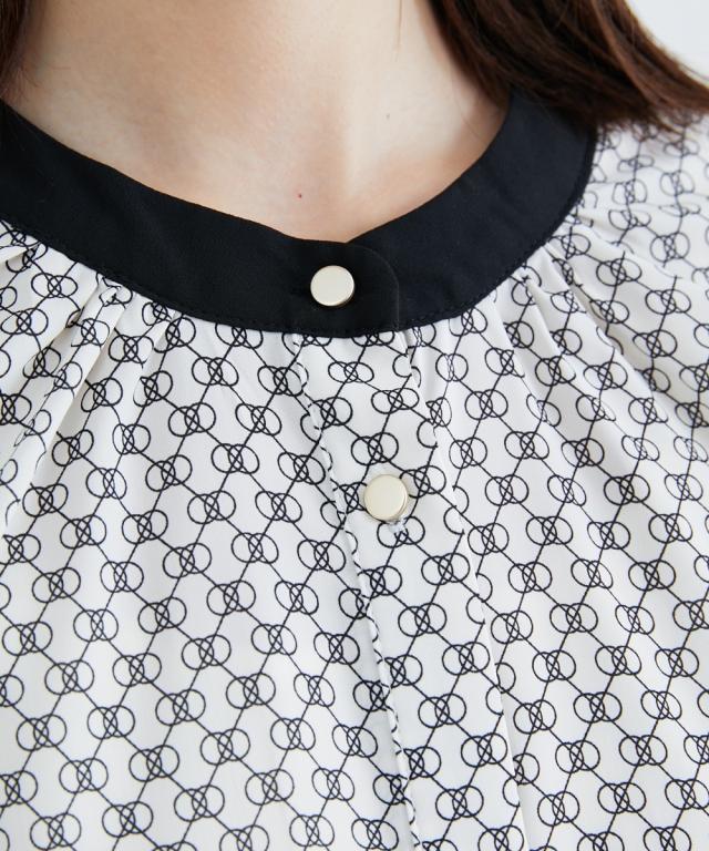 【高身長な方向け】幾何柄模様がこなれ感ある半袖ブラウス ■デザイン ・前ボタン開きで着脱もらくちん。ゴールドボタンは華やかな印象に。・衿周り、肩周りのギャザーで立体感をブラス。・二の腕周りをカバーしてくれる長めの半袖丈。 ■素材 ・ややツルっとした質感の素材・高級感のある総柄プリント。 ■おすすめのスタイリング 夏のオフィスシーンにぴったりなアイテム。シンプルなカラーでボトムを選ばずにコーディネートしやすいのもポイントです オフィスシーンだけでなく、カジュアルなボトムと合わせるだけでOFFシーンでも活躍できちゃう万能アイテムです。