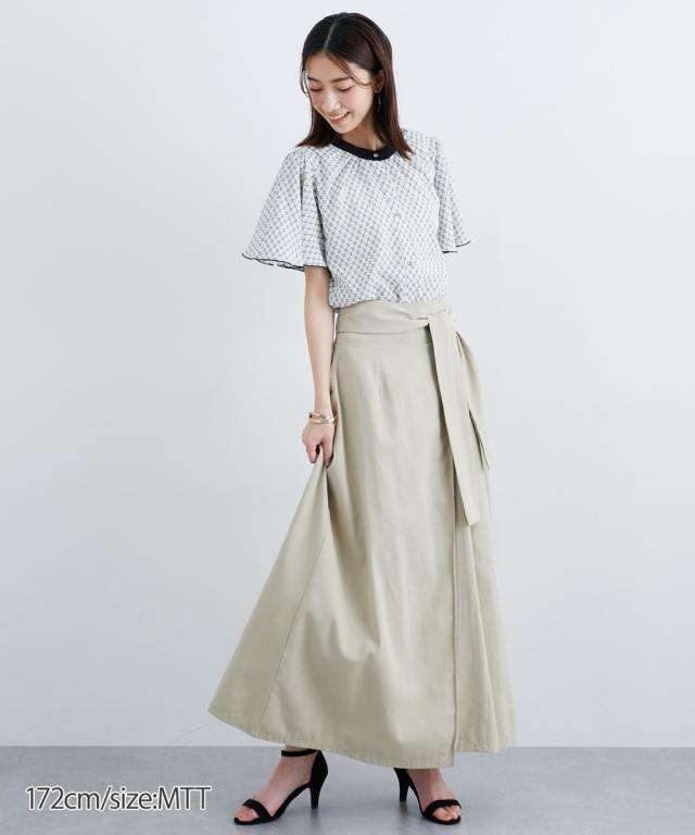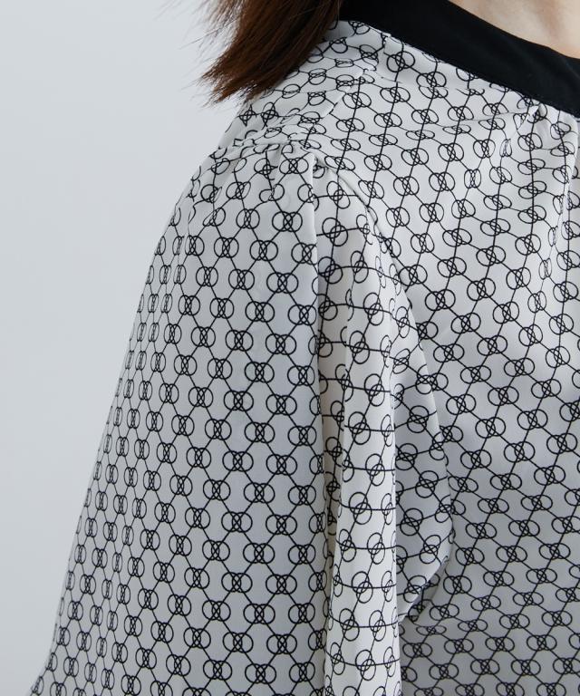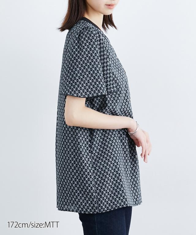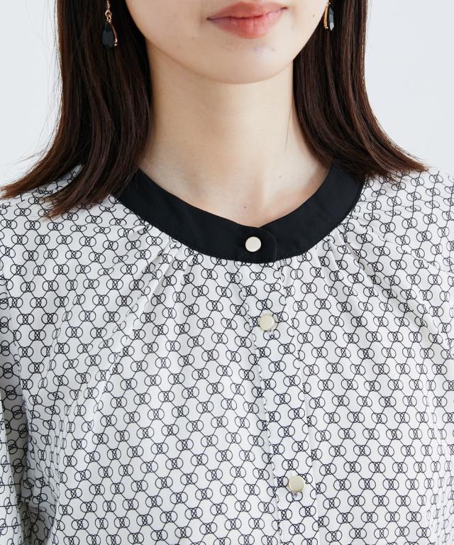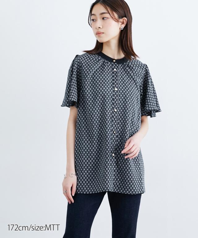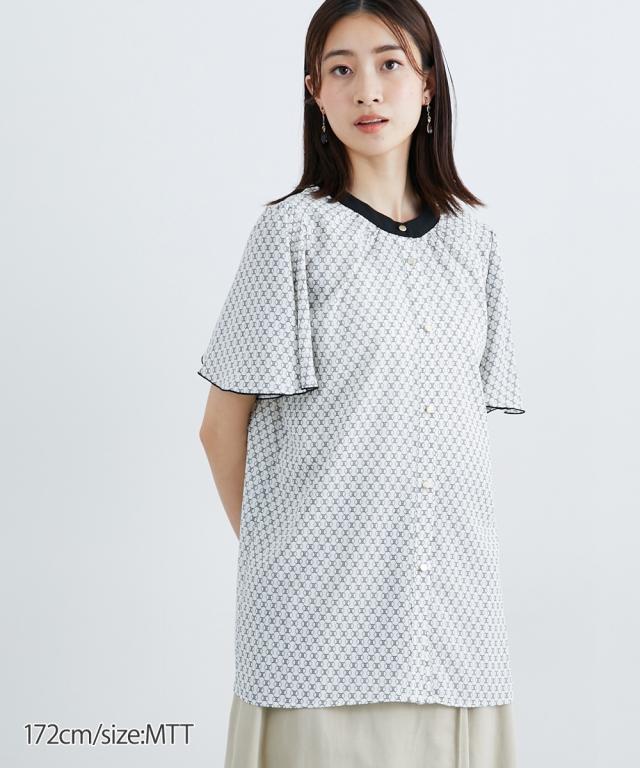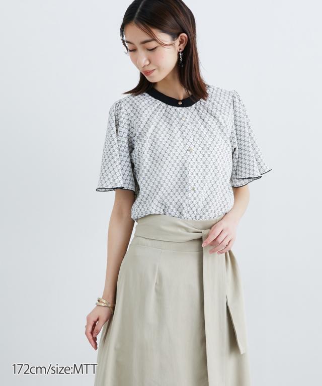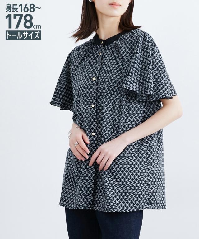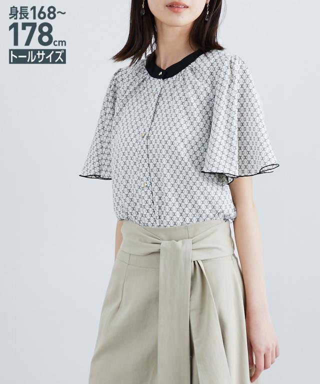 【高身長な方向け】幾何柄模様がこなれ感ある半袖ブラウス ■デザイン ・前ボタン開きで着脱もらくちん。ゴールドボタンは華やかな印象に。・衿周り、肩周りのギャザーで立体感をブラス。・二の腕周りをカバーしてくれる長めの半袖丈。 ■素材 ・ややツルっとした質感の素材・高級感のある総柄プリント。 ■おすすめのスタイリング 夏のオフィスシーンにぴったりなアイテム。シンプルなカラーでボトムを選ばずにコーディネートしやすいのもポイントです オフィスシーンだけでなく、カジュアルなボトムと合わせるだけでOFFシーンでも活躍できちゃう万能アイテムです。