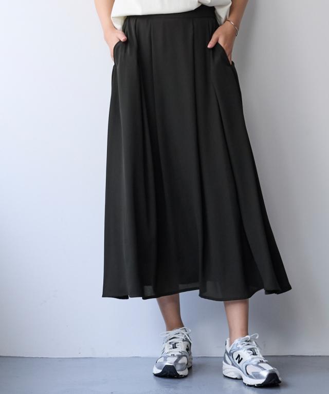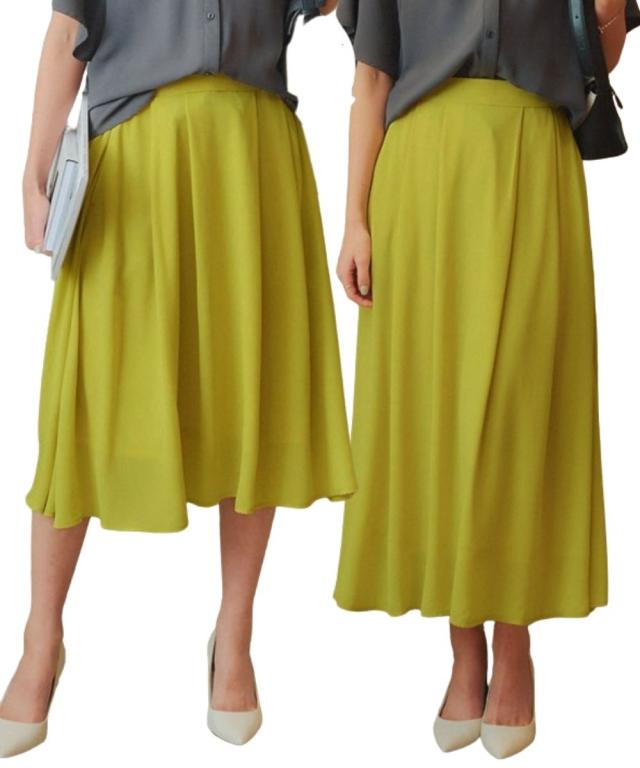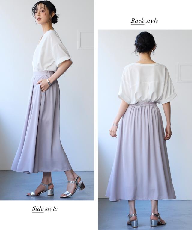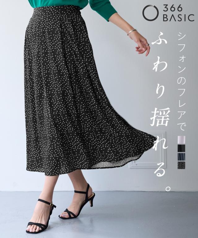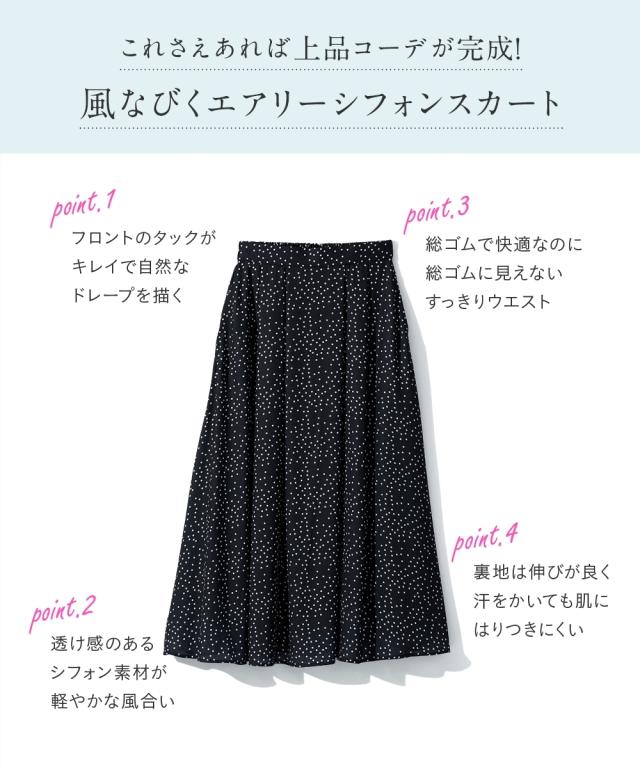 【これさえあれば上品コーデ完成!丈が選べるシフォンスカート!】 身長や好みにあわせて選べる2レングス。多彩なコーディネートをお楽しみください ■デザイン フロント部分のタックが穿くだけで自然なドレープを描き、きれいなシルエットが実現しました。 ウエスト総ゴム仕様(スッキリご着用いただけるように前側のみゴム縮み分量を少ない設定にしております。総ゴムの為柔らかい着用感に仕上げております) ■素材 透け感のあるシフォンの軽やかな風合いが絶妙な揺れ感を生み出します。 裏地は伸びが良く、汗をかいても肌にはりつきにくい素材を採用しました。 ■コーディネイト どんなトップスとも相性が良い