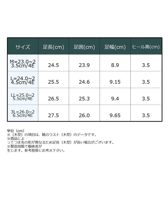 材質=合成繊維 底材=合成底 底の厚さ(後ろ)=約4.5cm ワイズ=4E 重量=約180g(4E:Lサイズ片足) ※生産時期や素材などによって多少個体差があります。 甲ベルトはゴム仕様 原産国:中国製 備考:単位(cm) ※(木型)の項目は、靴のラスト(木型)のデータです。 ※商品によってつま先の形が異なるため足長(木型)が長い場合がございます。 ※製造段階で個体差が生じます。参考程度にお考え下さい。