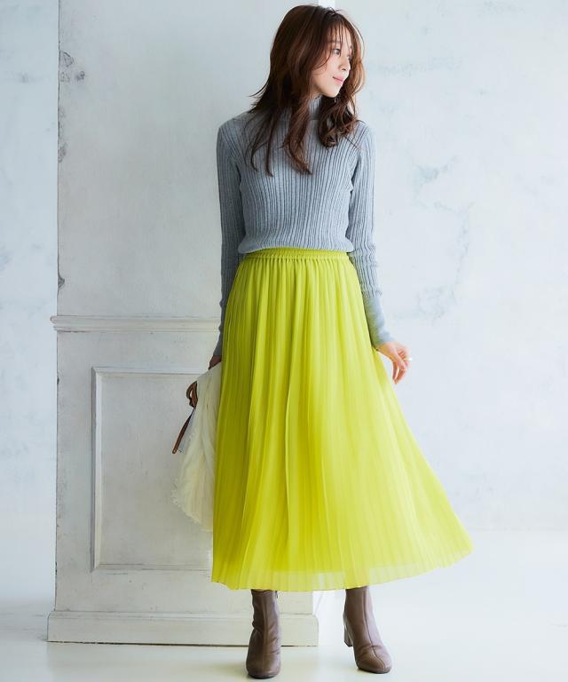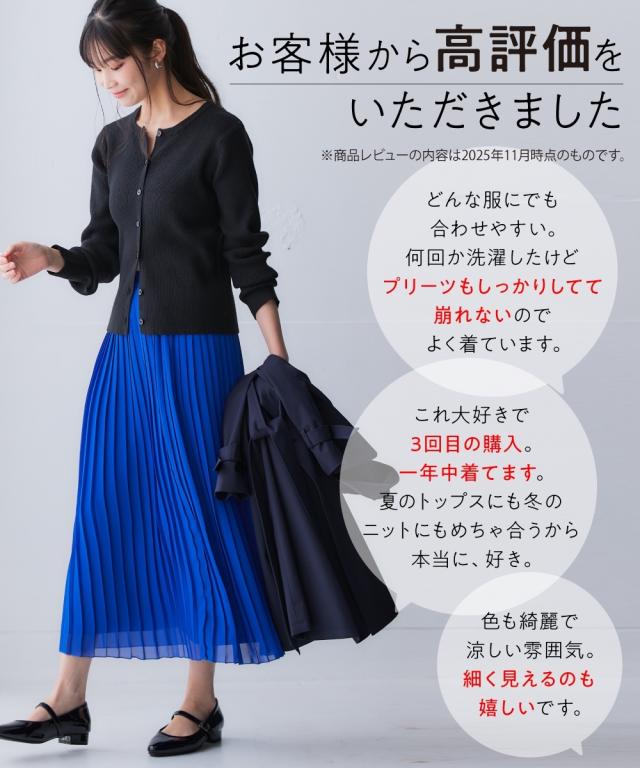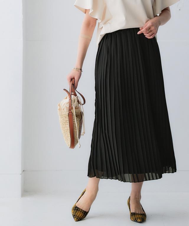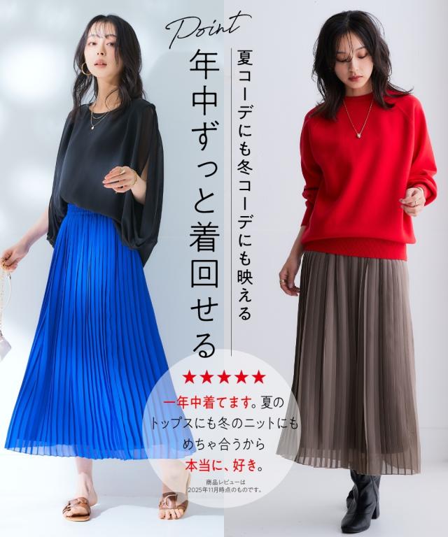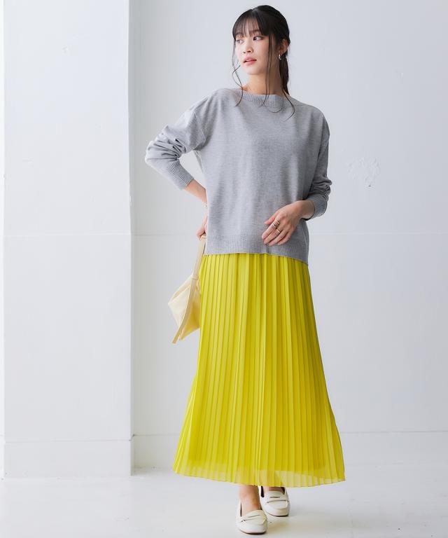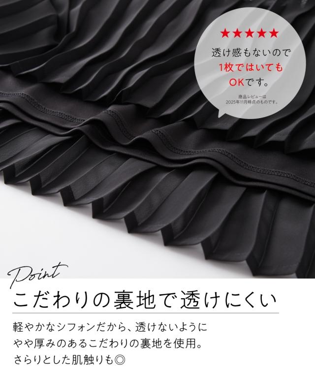 歩くたびにひらりと揺れる軽やかシアー素材のシフォンプリーツスカート。洗練された細め幅のプリーツやウエスト部分の工夫で、控え目に広がるAラインシルエットが魅力です。1点投入で着映えが叶い、レイヤードスタイルもしやすくロングシーズン活躍します。■デザイン細かなプリーツデザインが繊細な女性らしさを演出し、プリーツの縦ライン効果ですっきり見えしつつも、広がりすぎないシルエットが落ち着いた大人な雰囲気に。裏側にはやや厚みのあるカットソー裏地を使用することで、見た目の軽やかさはそのままに肌触りもよく透けにくい工夫も。ウエスト部分は総ゴム仕様になっており、きちんと見えしながらもリラックス感のある着用感です。■素材表地:繊細で上品な透け感のある軽やかシフォン素材にプリーツ加工を施しました裏地:透け防止のため、やや肉厚なさらりとした肌触りのカットソー素材を付けています■おすすめのスタイリングシンプルなデザインでトップスを選ばすコーディネートしやすいアイテムです。スニーカーコーデのカジュアルスタイルから大人レディなエレガントコーデまで幅広くお使いいただけます。長めトップスやワンピースとのレイヤードもオススメ春先には上品トップスと