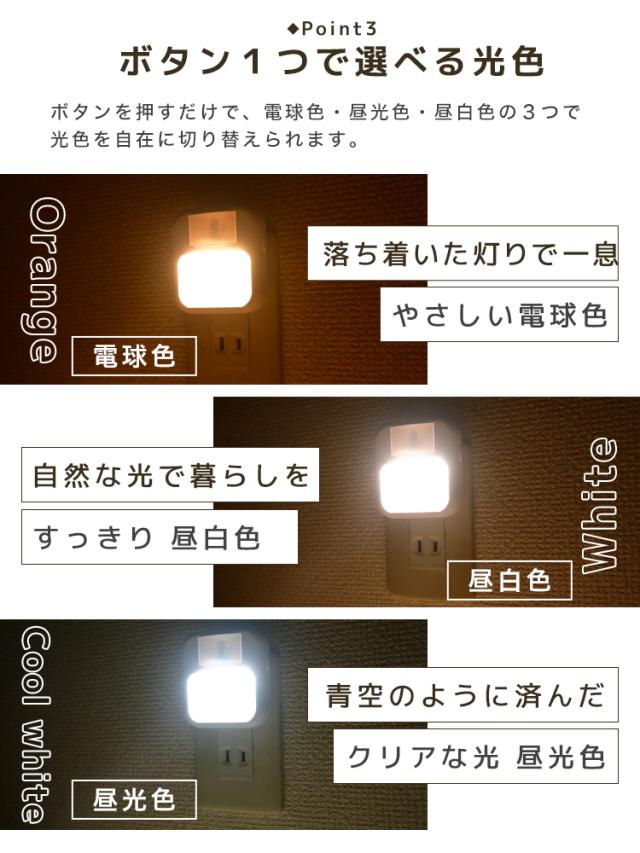 | 特徴 | 昼光色、昼白色、電球色 コンセント式 人感センサー 工事不要どこでも取付取外し可能 |
