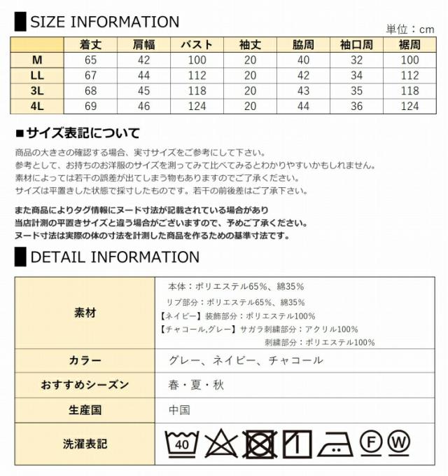 4L:着丈69 肩幅46 バスト124 袖丈20 脇周44 袖口周36 裾周124