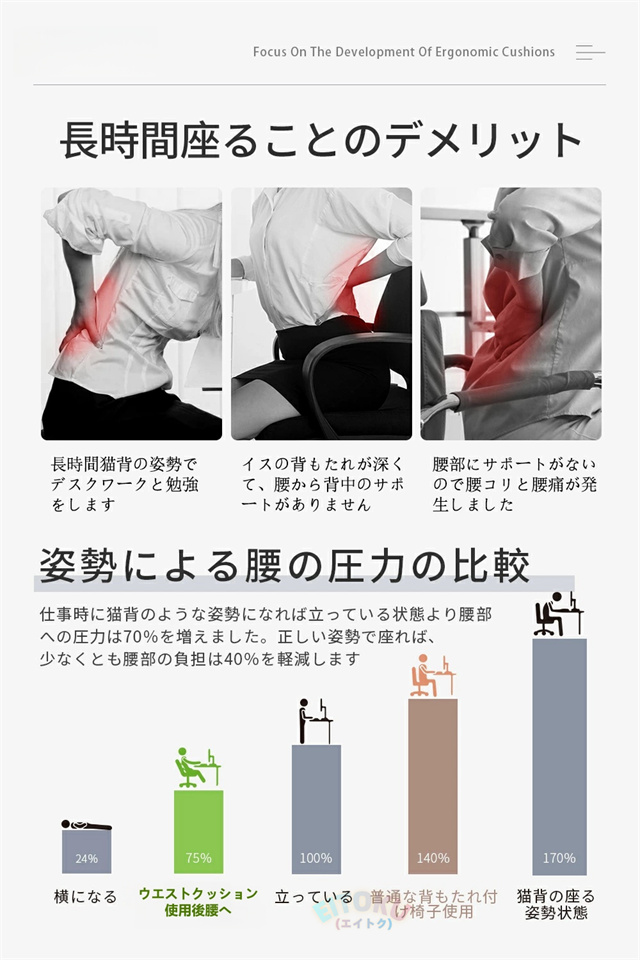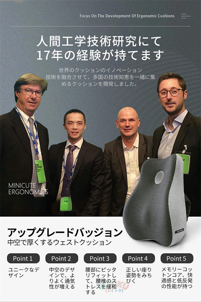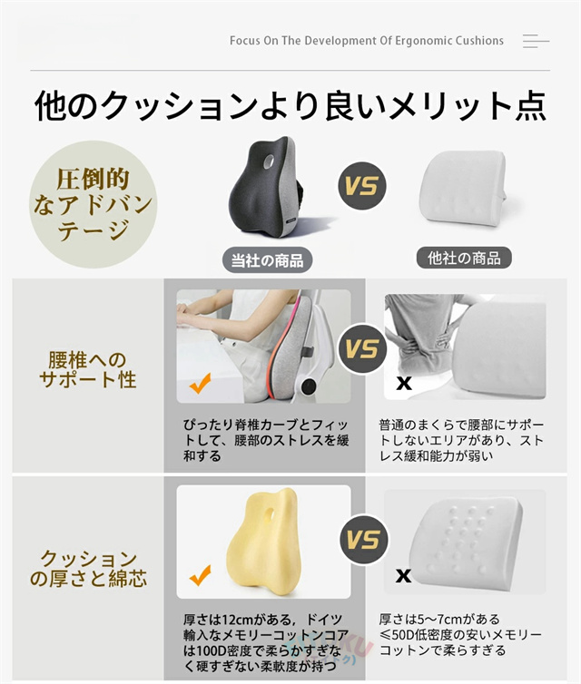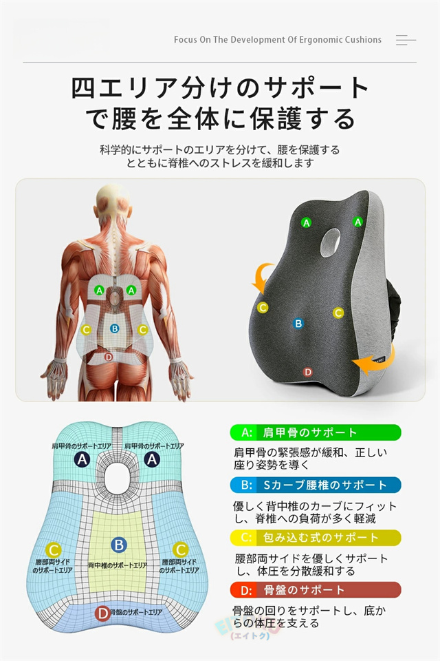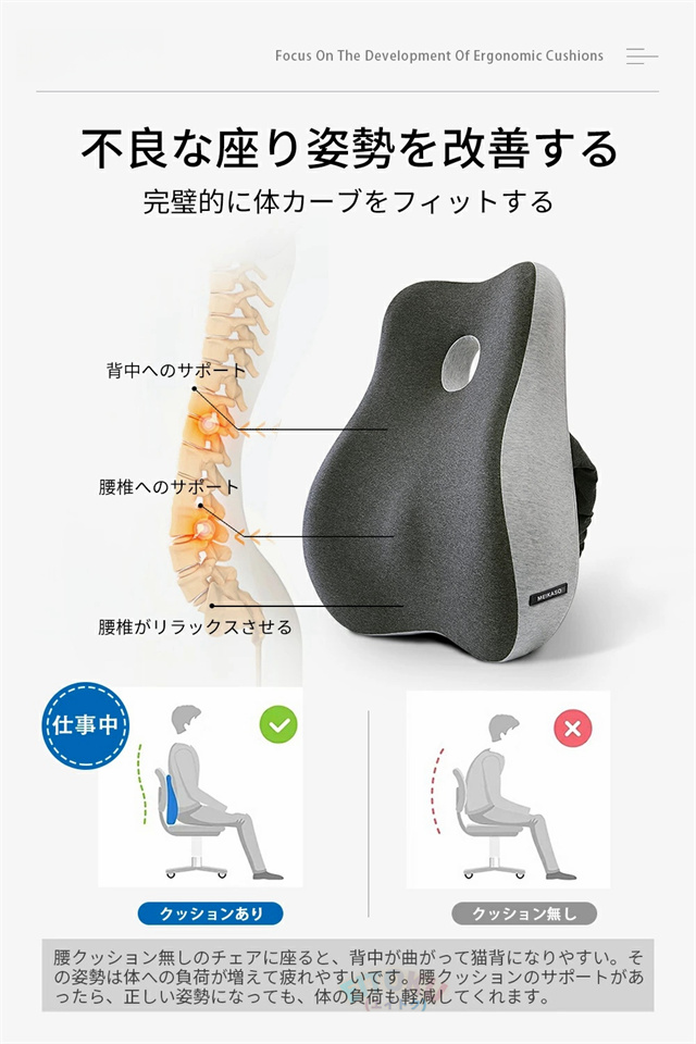 このクッションは腰部をよりよくサポートしてくれます。ぴったり背中の筋肉と脊椎のS形カーブにフィットしてそれとなく正しい姿勢に導いてくれます。